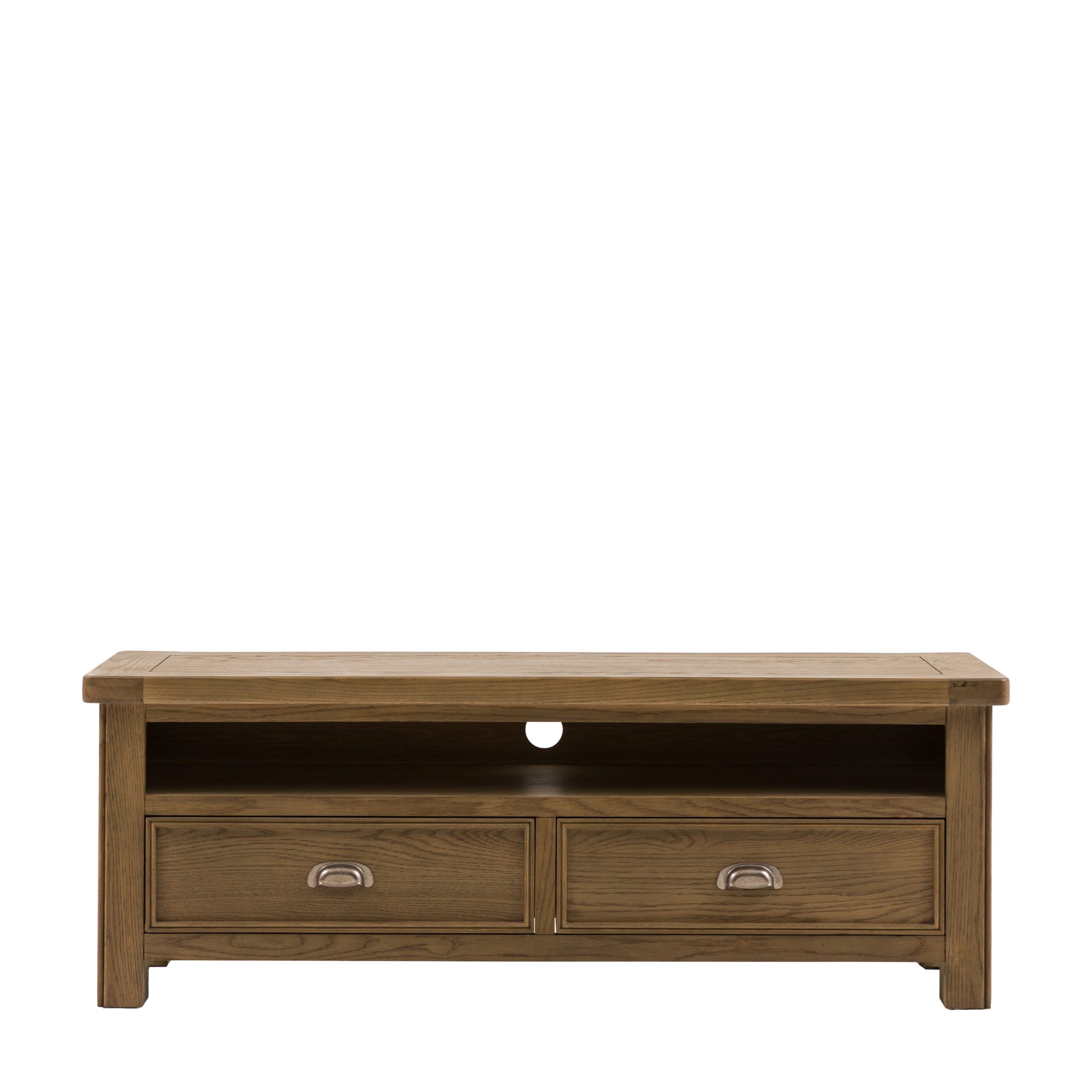 Organise your entertainment space with this charming media unit. Its sturdy design provides a stable base for your television and electronics, while the spacious open shelf offers easy access for devices and cables. Two convenient drawers conceal any clutter, finished off with a pair of chic metal handles, perfectly blending seamless functionality with a classic design. The solid oak & veneers with its rich grain detail will add warmth to a room, creating the perfect piece for a wide range of interior styles.