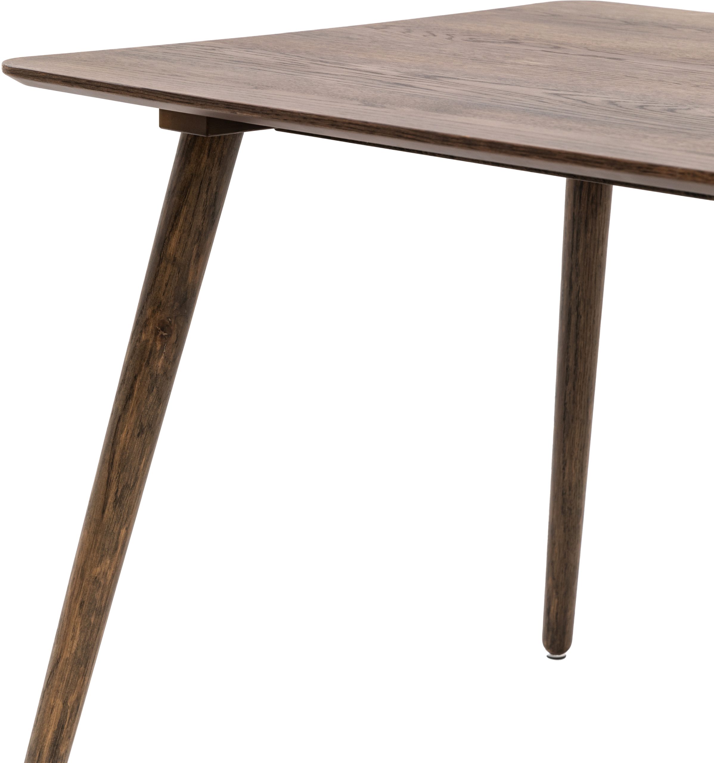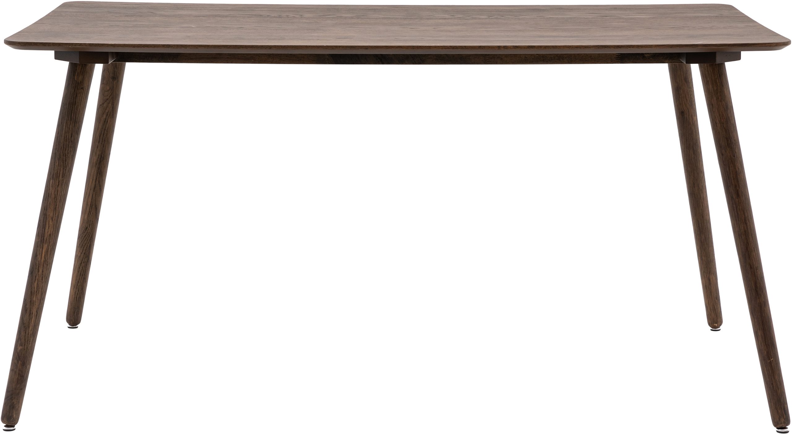 Offering retro style with a contemporary touch, this beautiful dining table features gently rounded corners which pair perfectly with the elegant legs. It is crafted from oak veneers and rubberwood with a smoked oak finish. The table is also available in a natural finish, and matching pieces are available.
