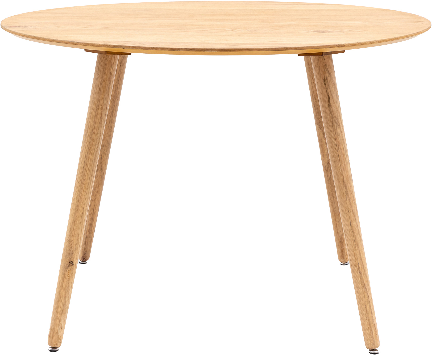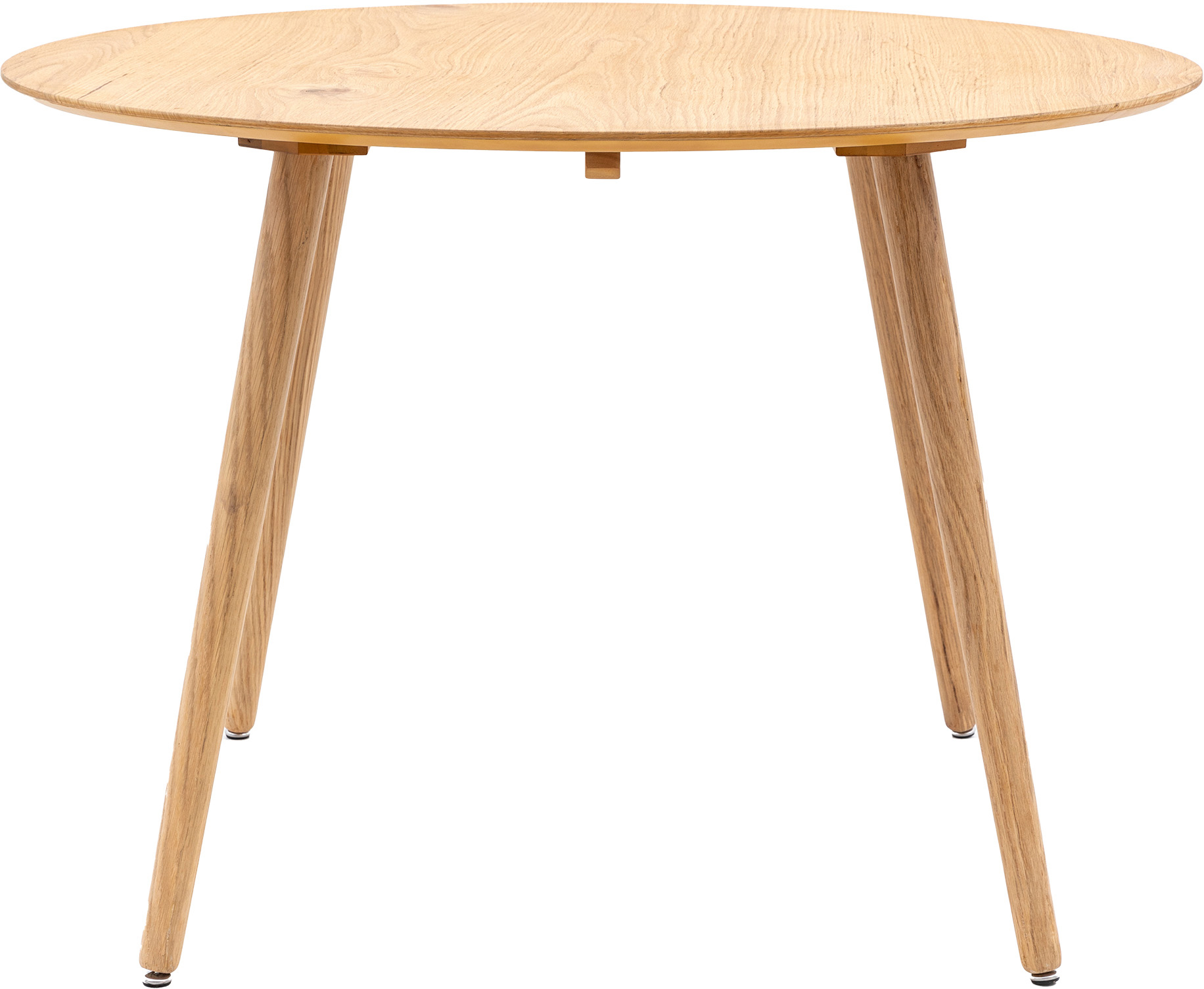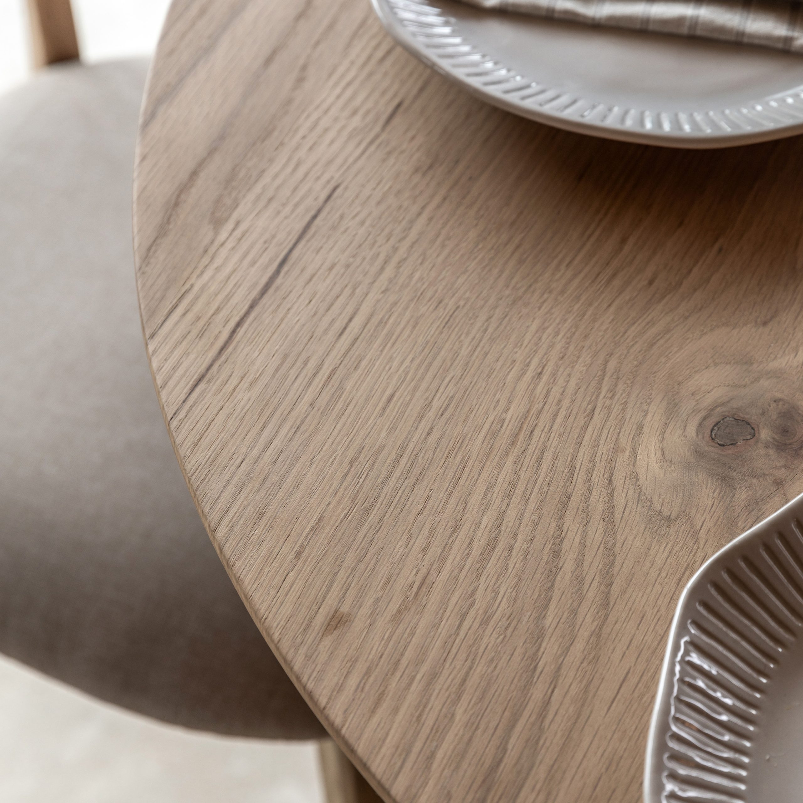 Offering retro style with a contemporary touch, this beautiful round dining table is crafted from oak veneers and rubberwood with a natural finish. The table is also available in a smoked oak finish, and matching pieces are available.