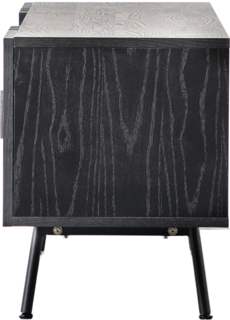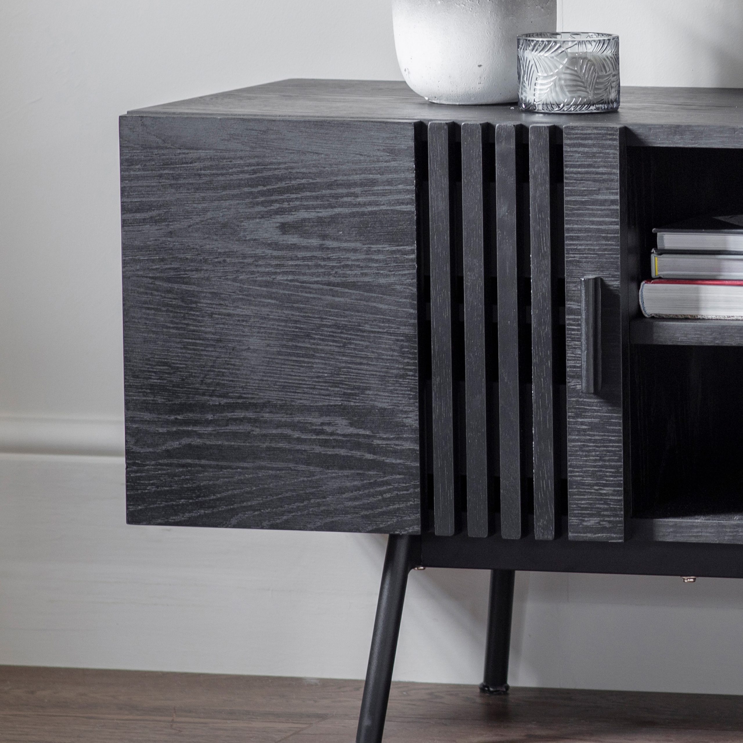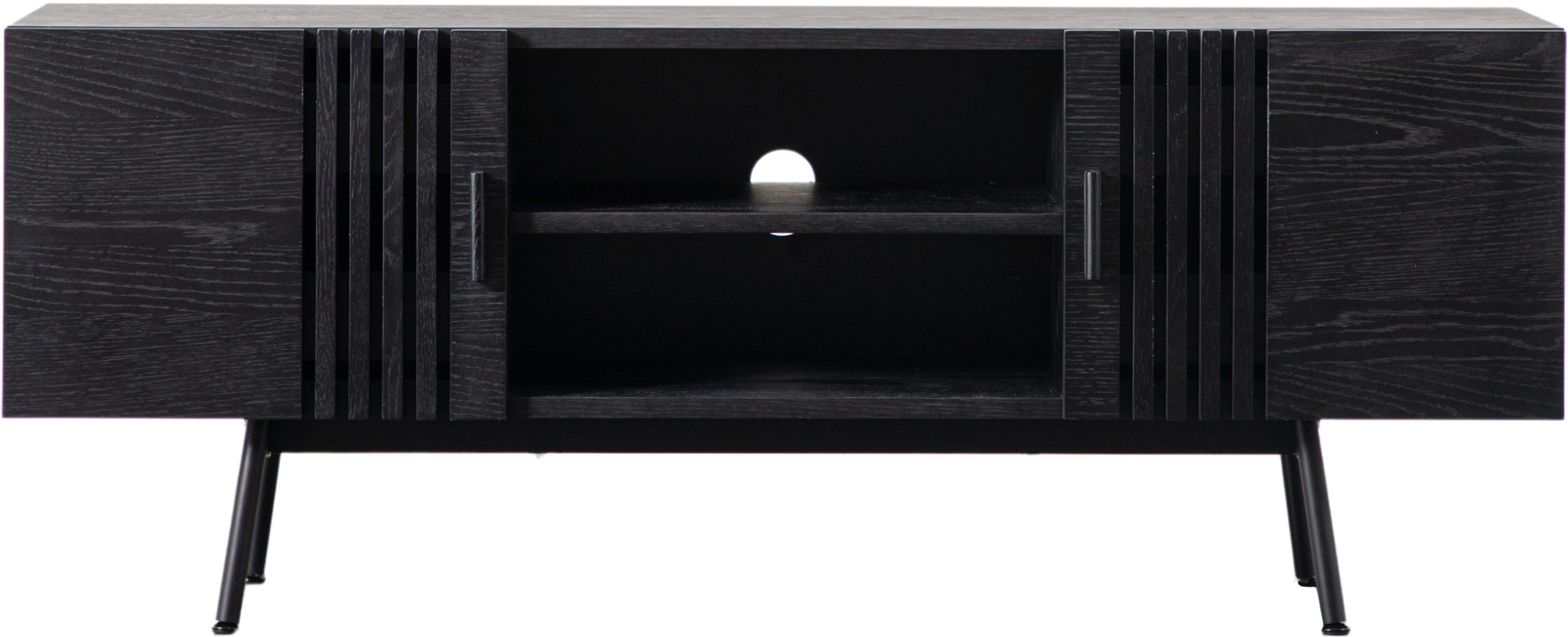 This stunning media unit offers a striking contemporary look, with the slatted design on the doors adding interest. Crafted using solid oak for the slats and oak veneers, the matt black finish beautifully shows the grain of the wood and pairs perfectly with the matt black metal legs. Matt black solid oak handles add the finishing touch. Internally, each cupboard has an adjustable shelf for added practicality. The shelf in the central section is fixed. The unit is part of a collection which offers a selection of cabinets.
