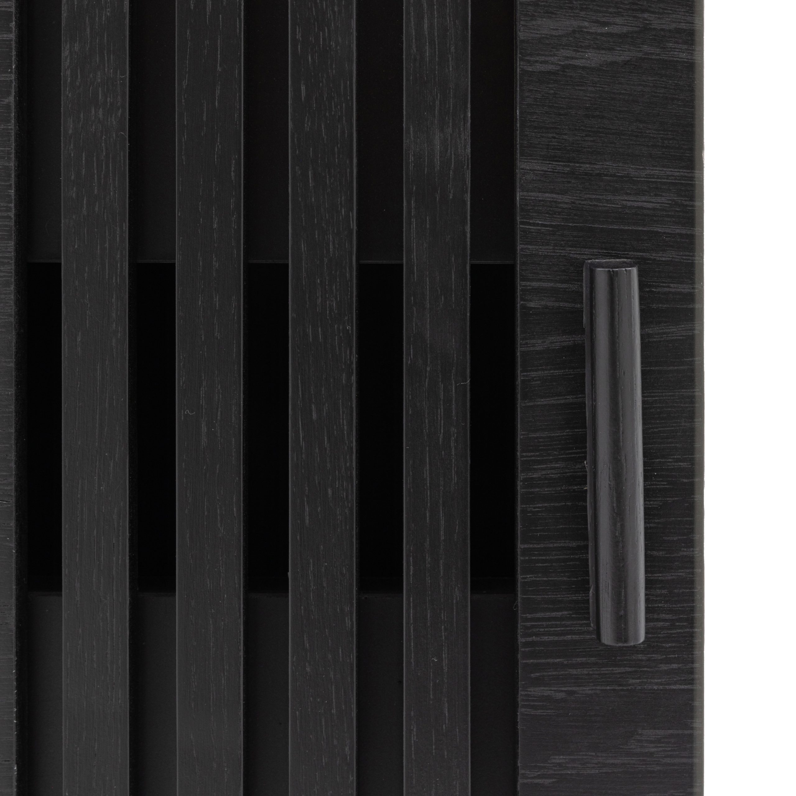 This stunning side table offers a striking contemporary look, with the slatted design on the door adding interest. Crafted using solid oak for the slats and oak veneers, the matt black finish beautifully shows the grain of the wood and pairs perfectly with the matt black metal legs. A matt black solid oak handle adds the finishing touch. The unit is part of a collection which offers a selection of cabinets.