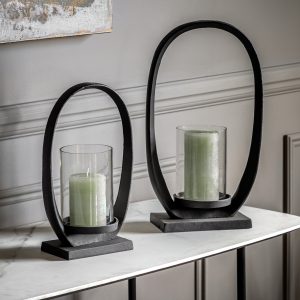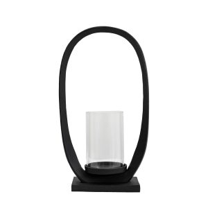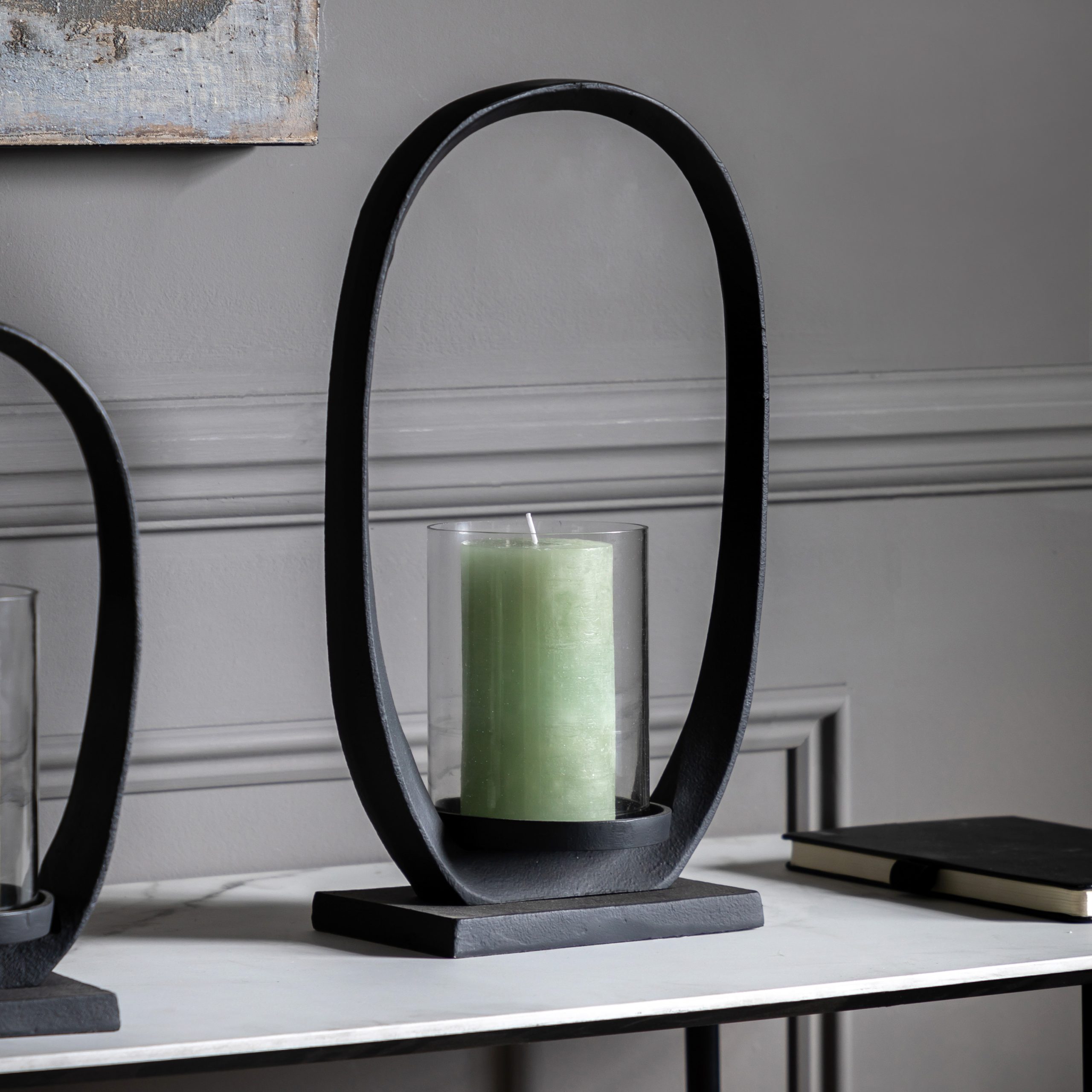 Gallery Direct Hooper Lantern Large Black A contemporary twist on a lantern, the bold loop shape surrounds a simple glass cylinder, creating a stand out modern piece. Perfect for adding a warm glow to your room. Matching smaller lantern available. Candle not included.