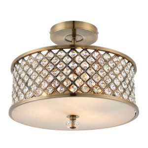 A flush ceiling pendant with an antique brass finish. The shade is made of crystal beads and an opal diffuser to the bottom. Both dimmable and suitable for use with LED lamps. Matching items available