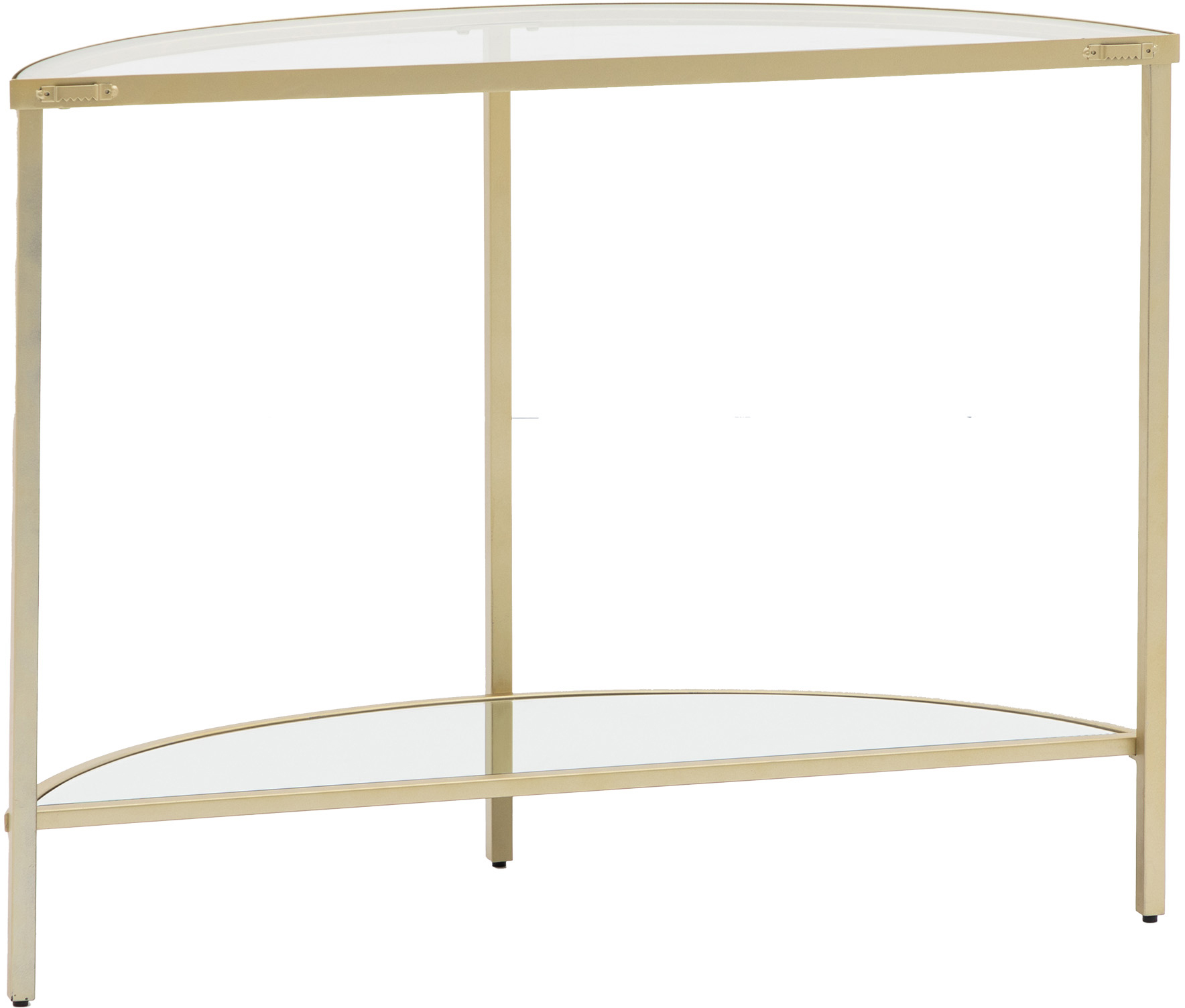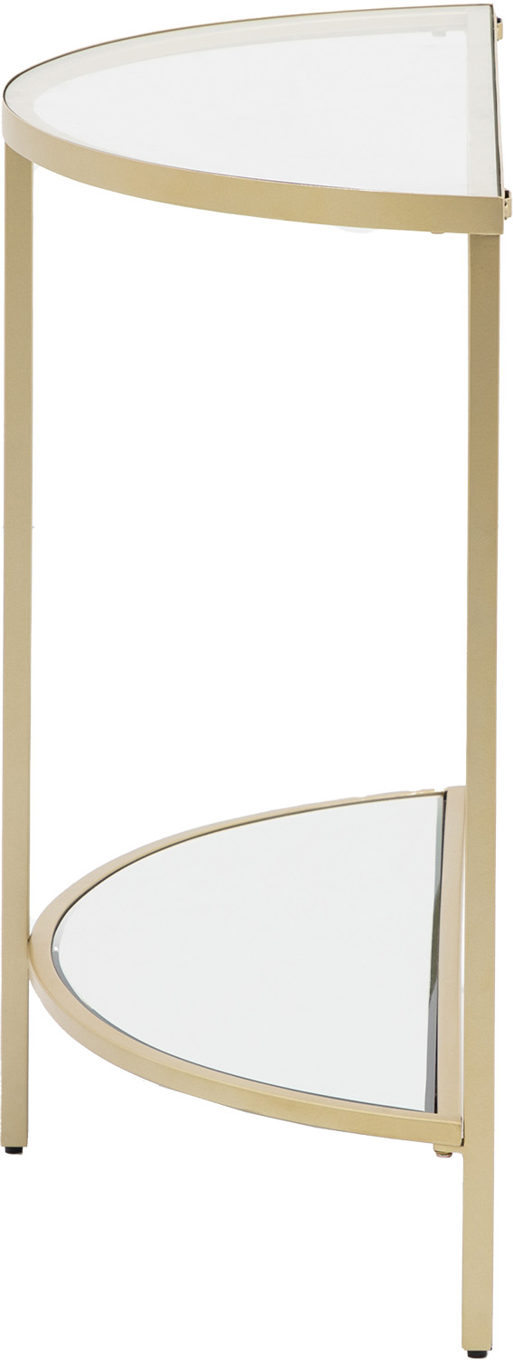 Gallery Direct Hudson Console Table Champagne Glamorous and eye catching Demi Lune shaped Console Table perfect for hallways, living rooms and beDoorooms alike. The tempered glass top shelf & mirror glass bottom shelf in a champagne metal frame will add a touch of luxury to any room.