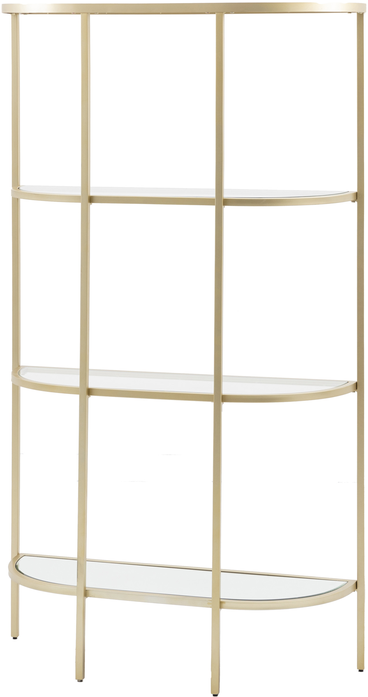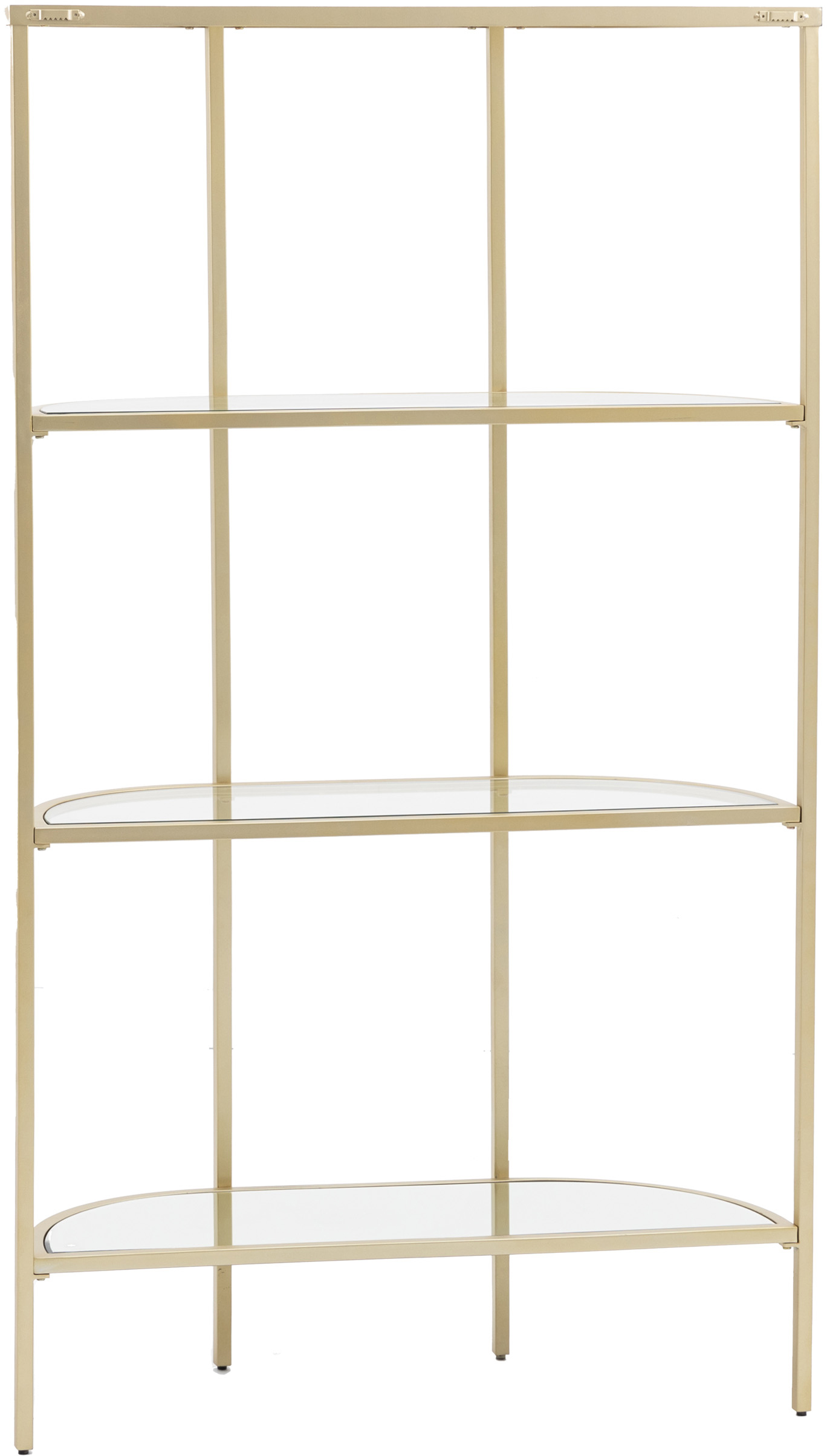 Gallery Direct Hudson Display Unit Champagne Glamorous 4 shelf display unit with a beautifully elegant curved shape. The 3 glass shelf inserts and a mirror glass bottom shelf sit in a champagne finish metal frame, perfect for adding a luxurious touch to any room.