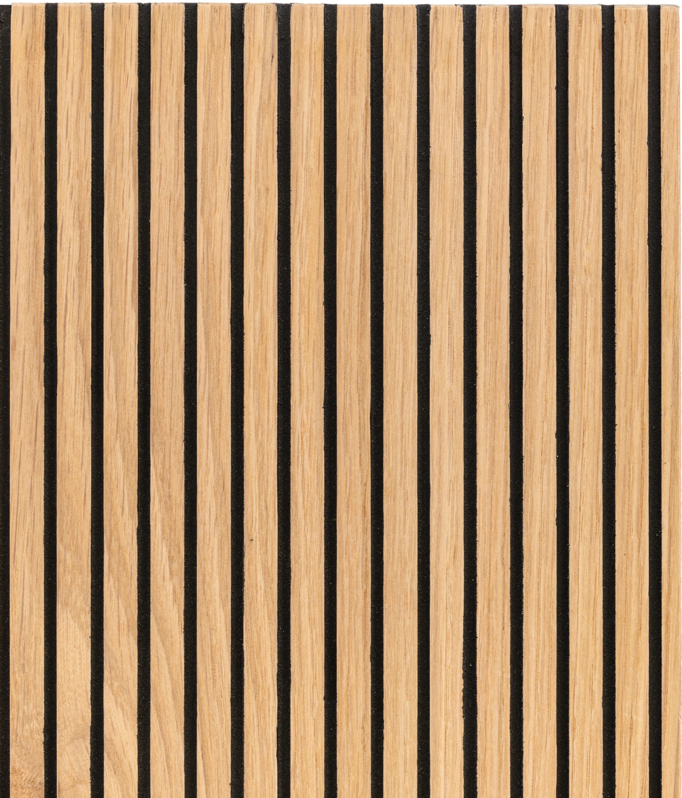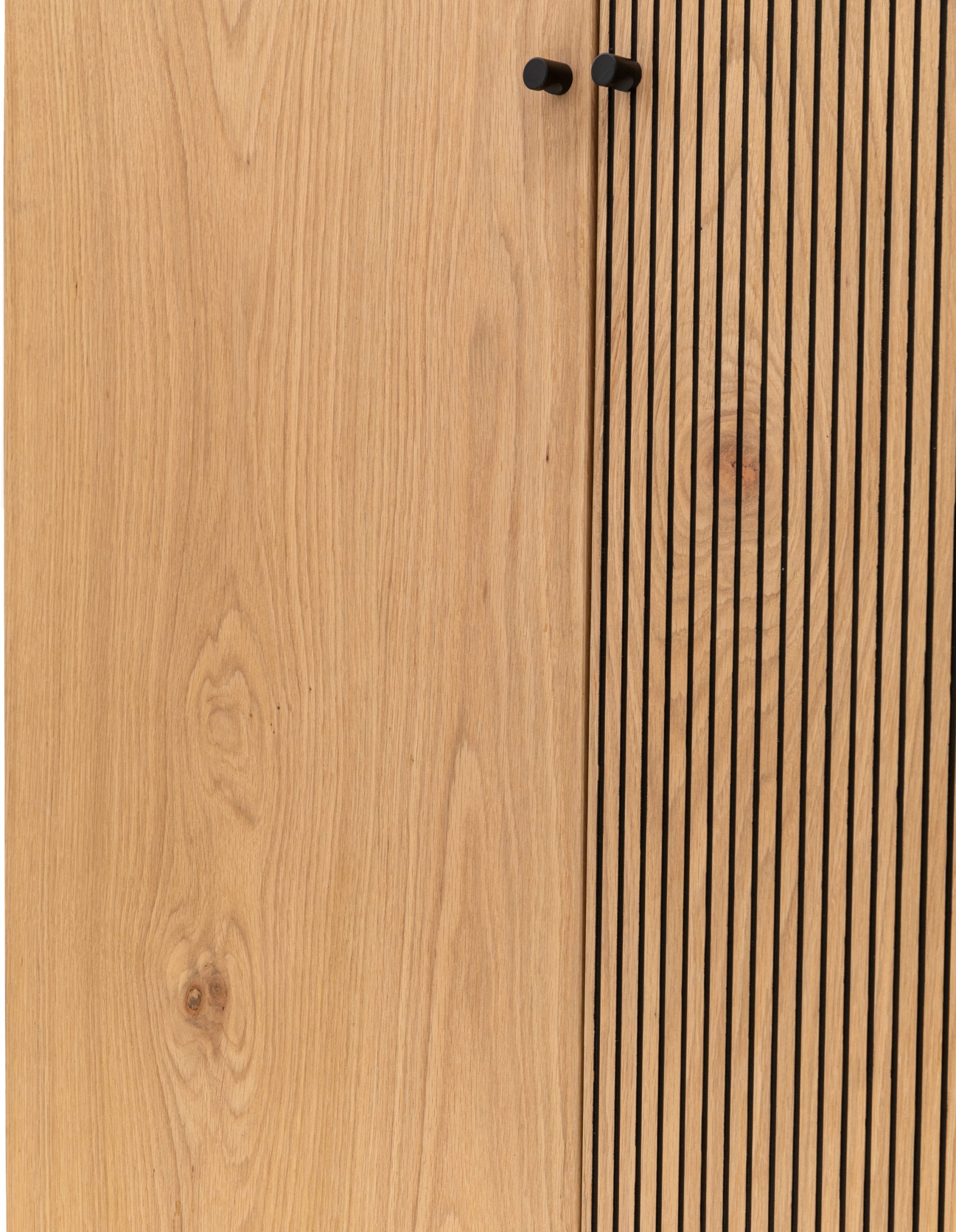 Add a contemporary look to a room with this stylish wardrobe. The carcase has a black finish with a pressed woodgrain effect to create a premium look. The door fascias are real oak woodgrain veneer with a feature black line pattern. A black metal underframe and door handle complete the look. Matching items available.