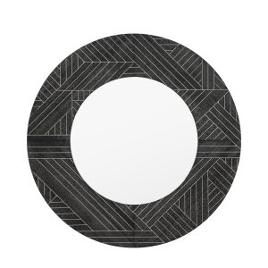 Gallery Direct Kakuda Round Mirror This unique contemporary mirror features a wooden frame in a black wash finish. The thin white geometric lines adds a striking visual impact to the home without overwhelming a minimalistic aesthetic. Available in two sizes.