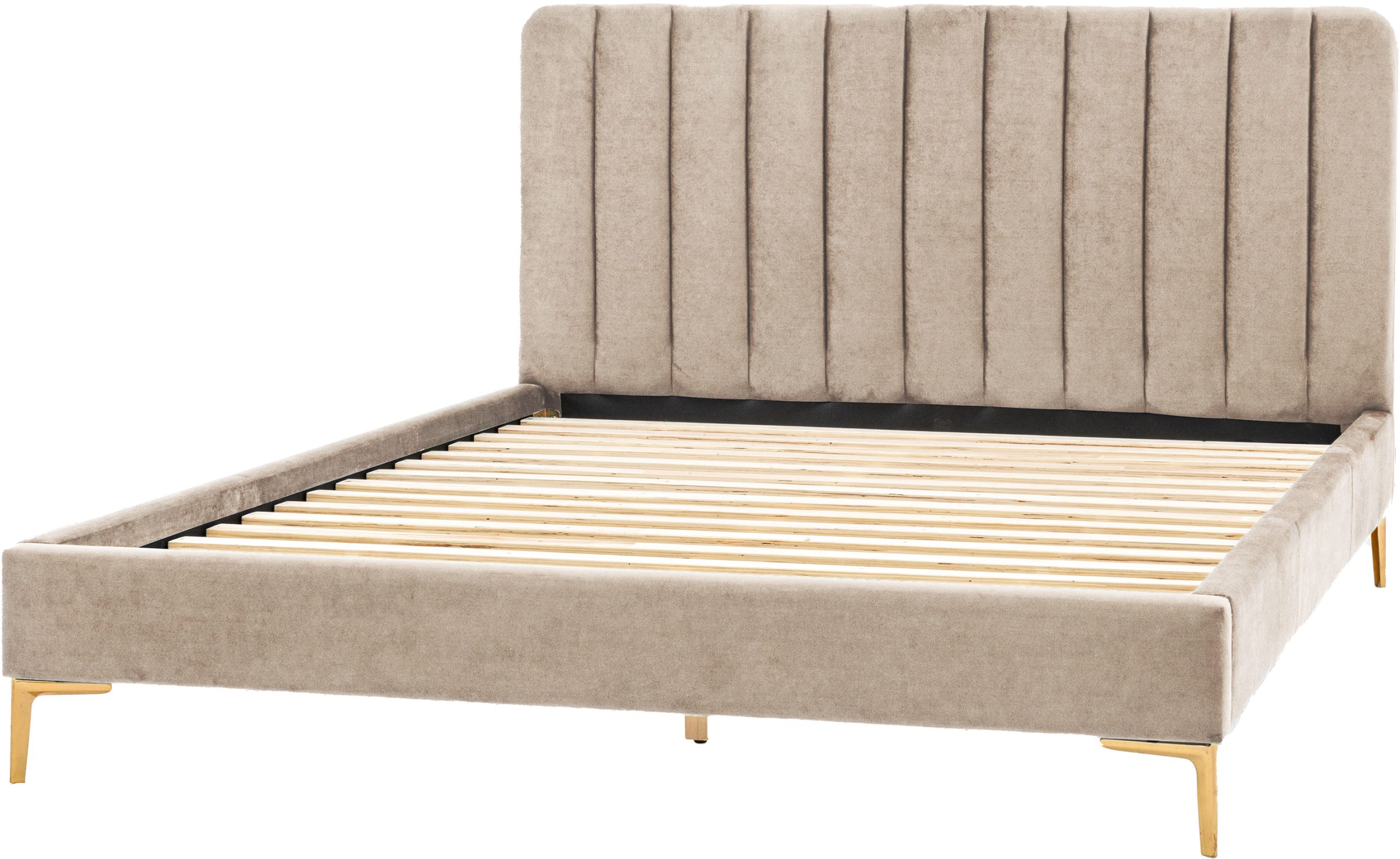 Add a touch of luxe to your bedroom with this lavish king size bedstead. Upholstered in creamy beige velvet the panelled headboard is cushioned with vertical stitch detailing and is complemented by the slim gold toned metal legs, adding that final touch of luxury. Also available in other sizes and colours.