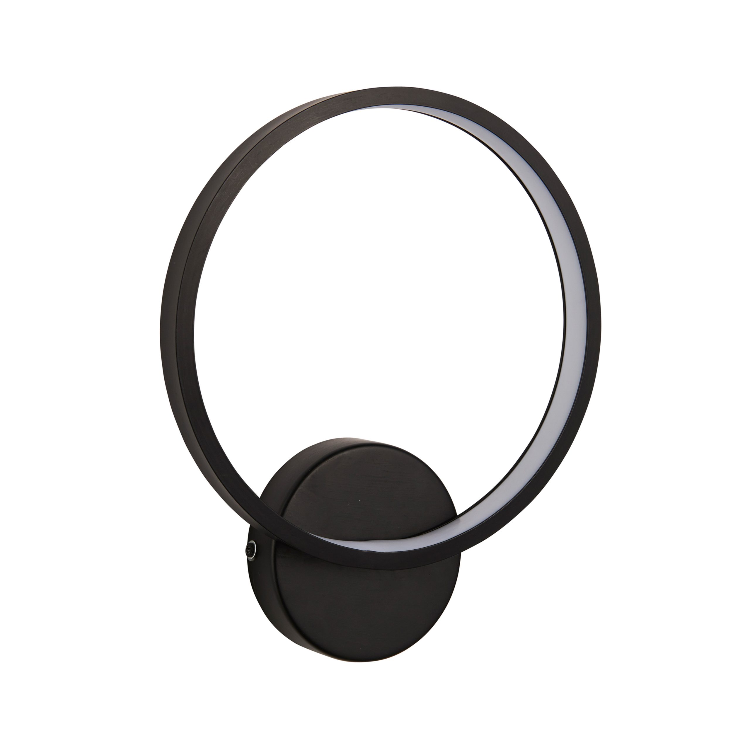 Designer architectural style wall light. Textured black finish with white diffuser this circular wall light is IP44 rated and corrosive resistant. Safe to use in bathrooms and outdoors.