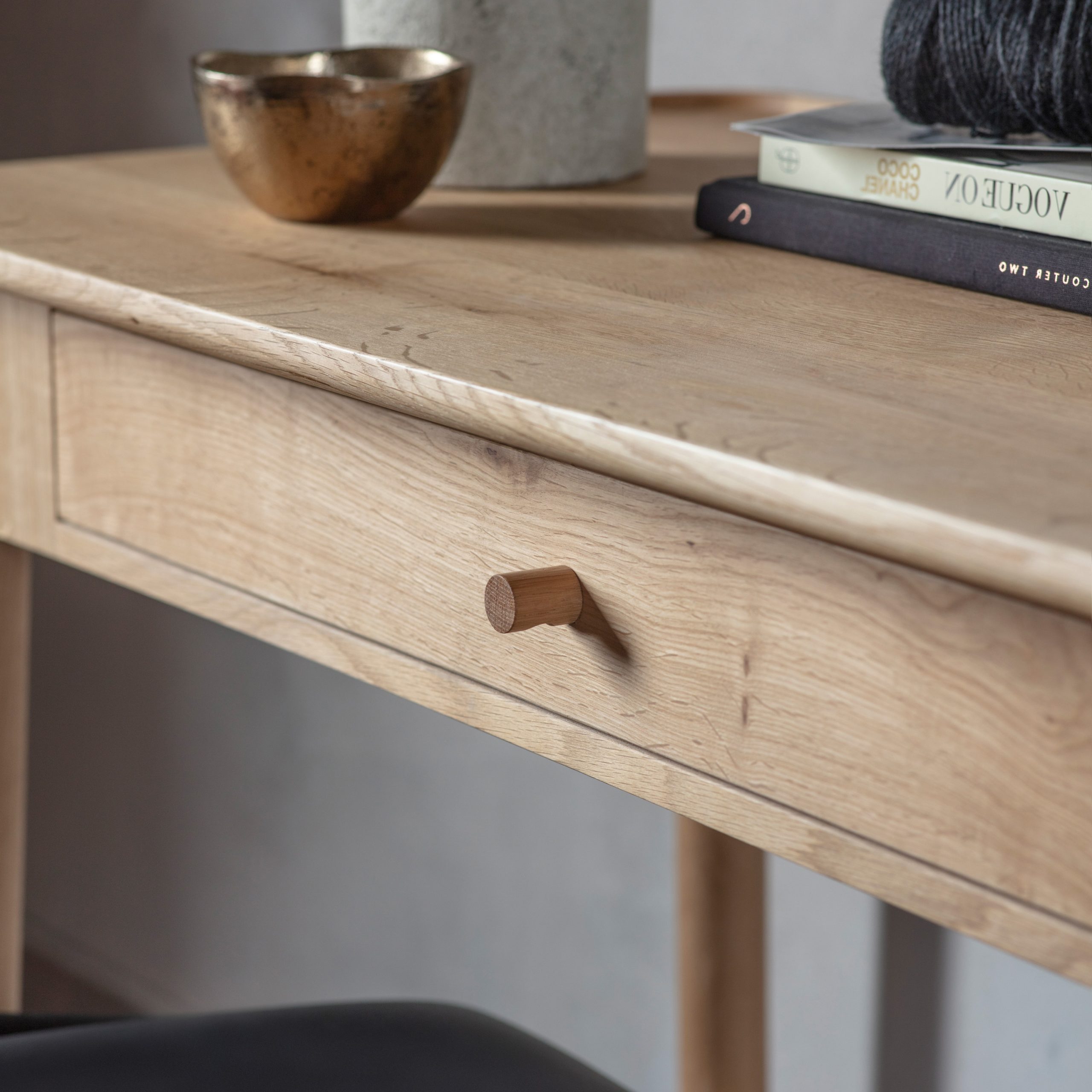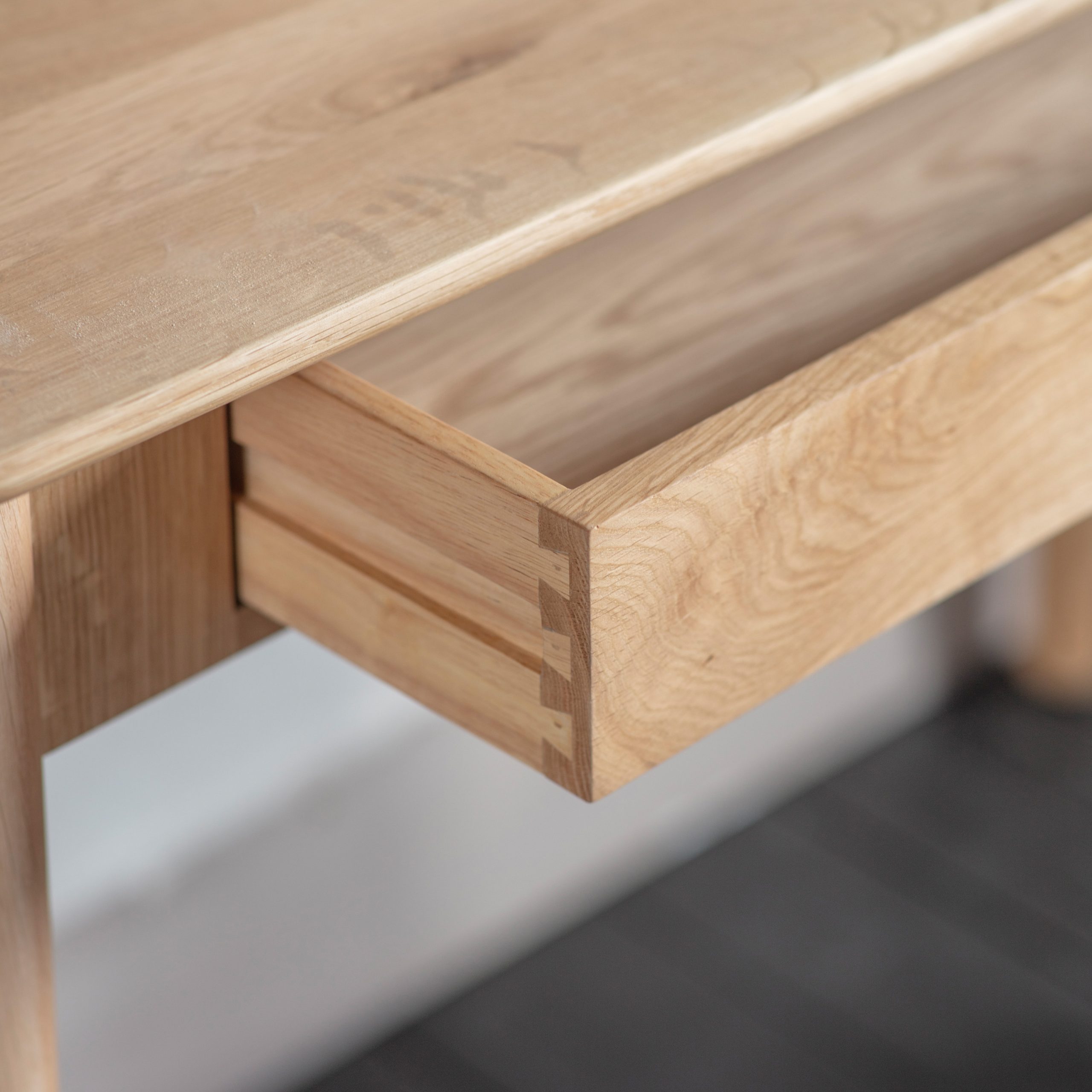 Kingham 1 Drawer Dressing Table/Desk 1100x500x800mm The Kingham collection showcases oak interior pieces with smooth lines, rounded corners and a natural finish. Clean, simple and effortlessly attractive. The designs pair their honest character with a contemporary edge, making them highly compatible with an array of home styles. Discover a perfect piece for your home and choose a Kingham today.