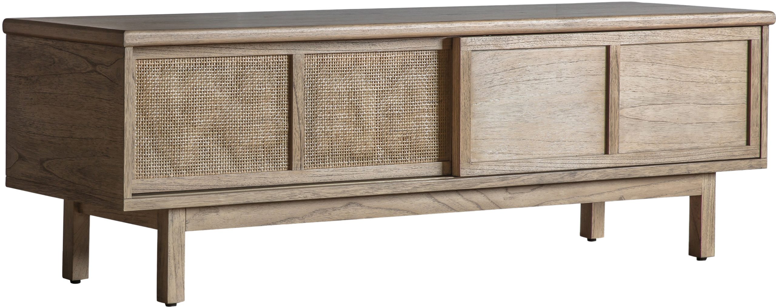 Developed with Japandi influences to give the ideal fusion of Japanese and Scandinavian design. This stylish media unit, which is crafted from Mindy ash solids and veneers, combined with hand-woven cane inserts, features sliding doors. This is the perfect range to add a touch of unique style to any interior, featuring a traditional lightly weathered finish with modern slatted detailing, hand-woven cane and brushed bronze handles. Also including a sideboard, cupboard, coffee and console table, plus a practical supper table and unique slatted side table, this collection adds a touch of simplistic minimalisation to any interior space. Due to the handmade nature of this product colour variations may be present.