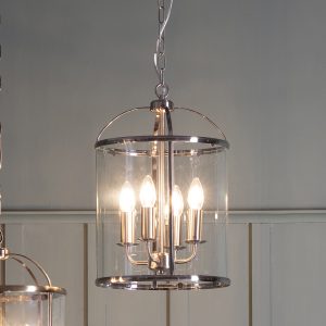 This 4 light pendant has an adjustable drop and combines a metal frame work with a satin nickel finish and clear glass panels. Suitable for use with LED lamps and dimmable. Other size and finish options also available