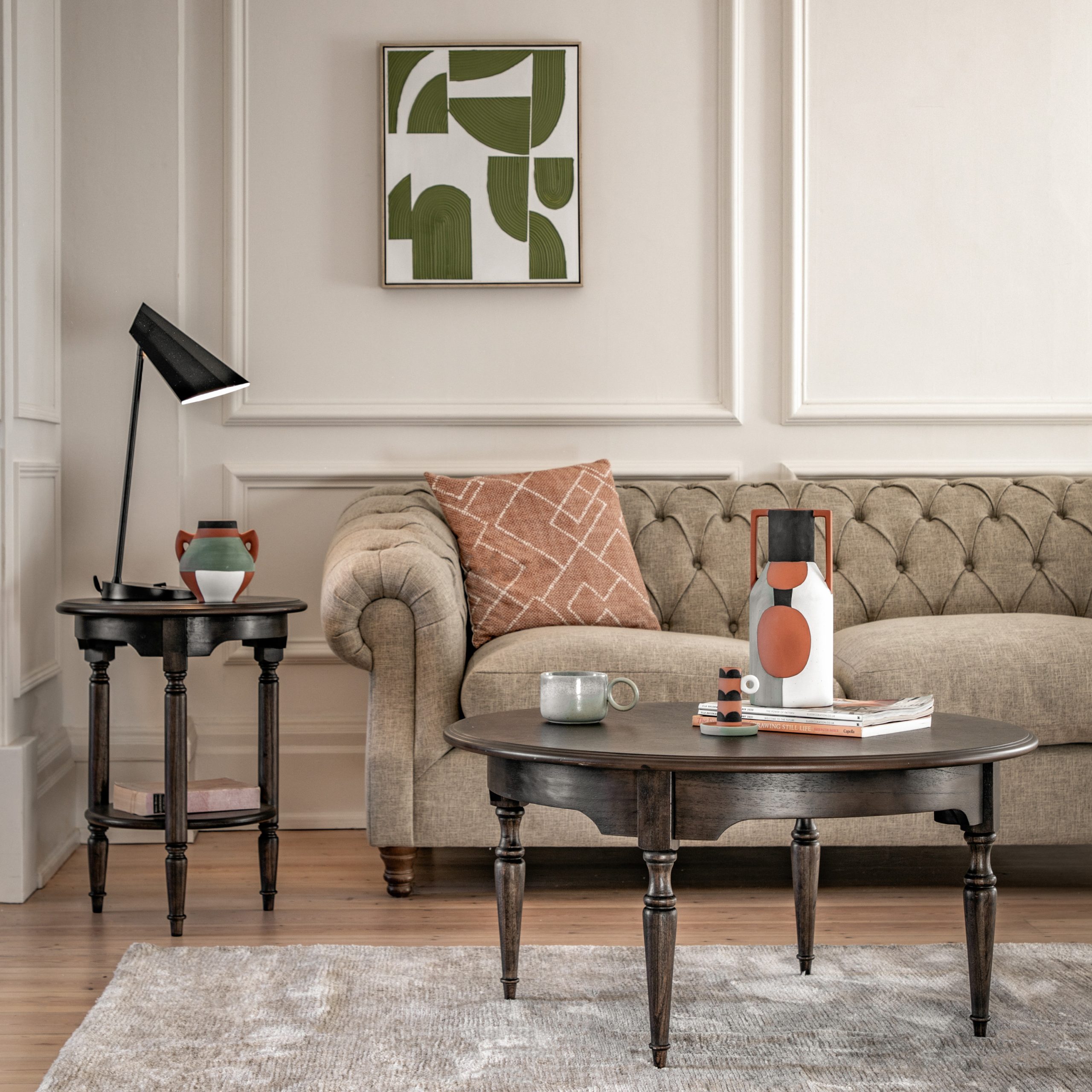 Offering a new traditional look, with its timeless, elegant style and a modern touch. This stunning coffee table features exquisite dark salvaged coffee colour finished Mindy wood solids & veneers, with elegant inlaid marquetry details adding a final elegant touch.