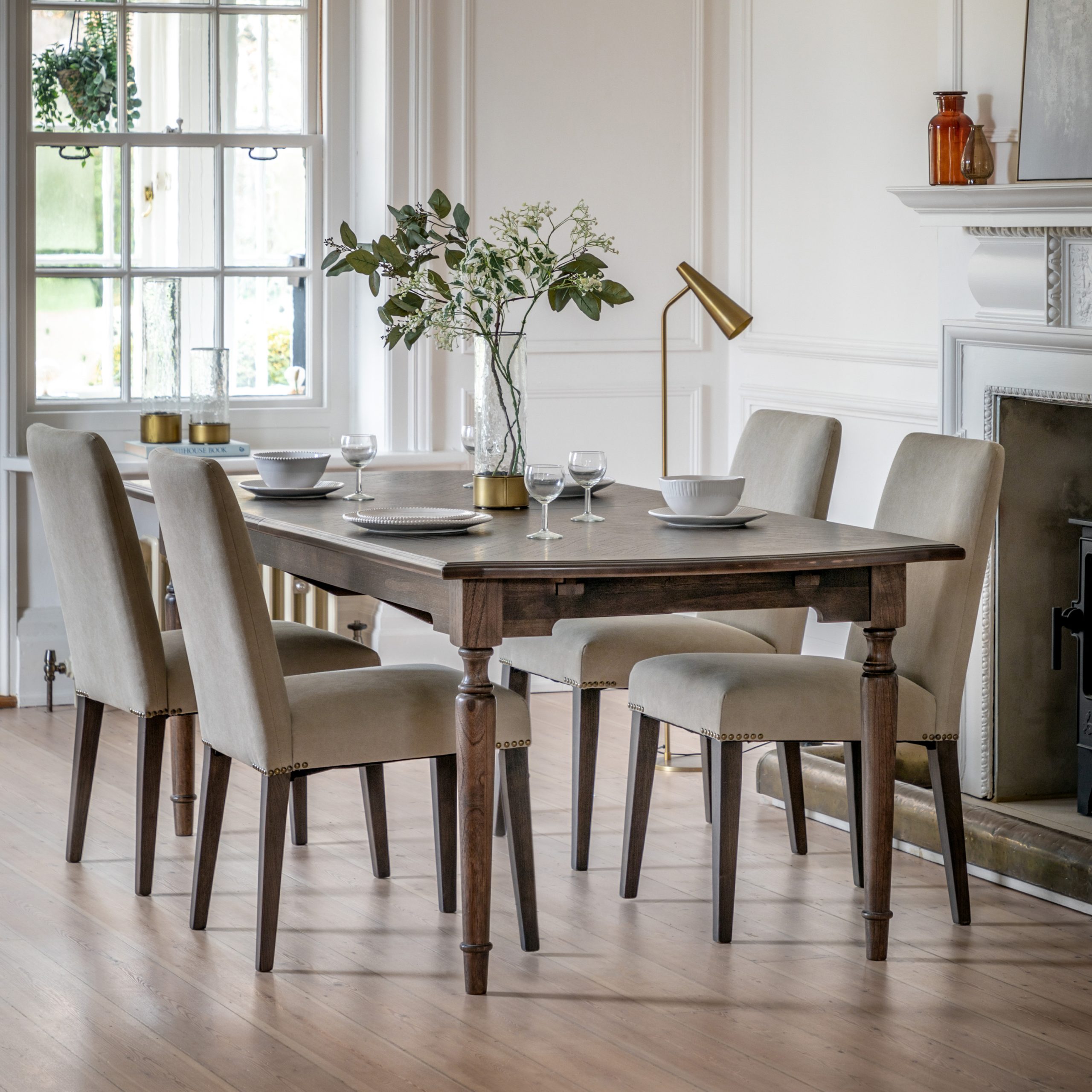 Gallery Direct Madison Extending Dining Table Designed to offer a new traditional look with its timeless elegant style with a modern touch, this stunning table will add a sophisticated look to a room. The exquisite dark salvaged coffee coloured Mindy wood veneers and marquetry are complemented by the solid Mindy wood turned spindle legs. For added practicality the table features butterfly centre leaves, so it can be extended to seat up to 10 people.