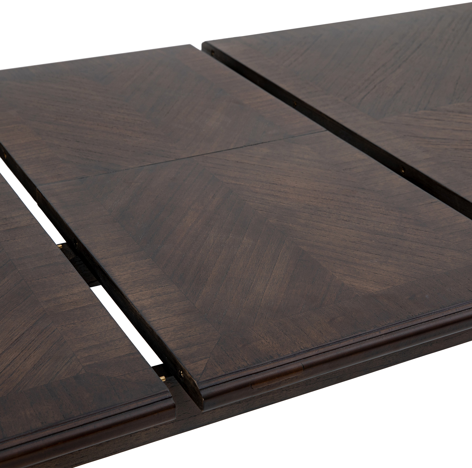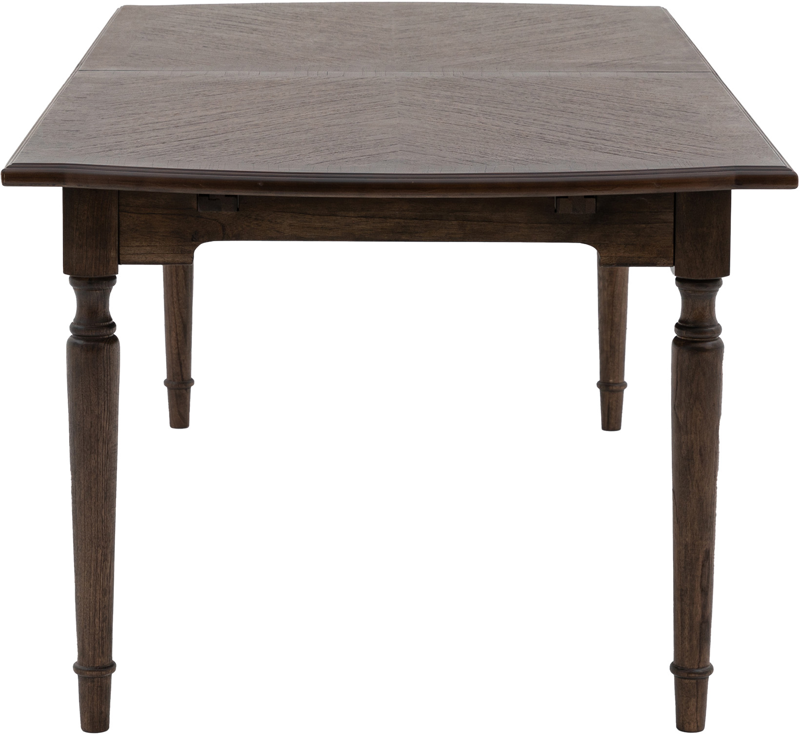 Designed to offer a new traditional look with its timeless elegant style with a modern touch, this stunning table will add a sophisticated look to a room. The exquisite dark salvaged coffee coloured Mindy wood veneers and marquetry are complemented by the solid Mindy wood turned spindle legs. For added practicality the table features butterfly centre leaves, so it can be extended to seat up to 10 people.