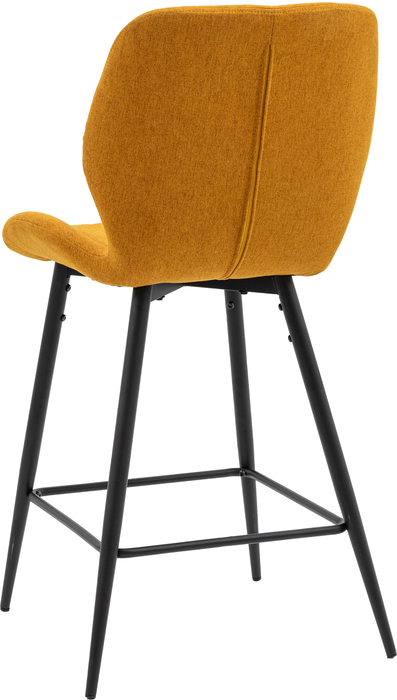 These mid-century inspired modern stools will make a stand out addition to your room. The shaped back and curved seat are upholstered in saffron colured fabric with extra stitch detailing, paired with metal legs, for a contemporary look. Also available in other colours, and matching chairs available.
