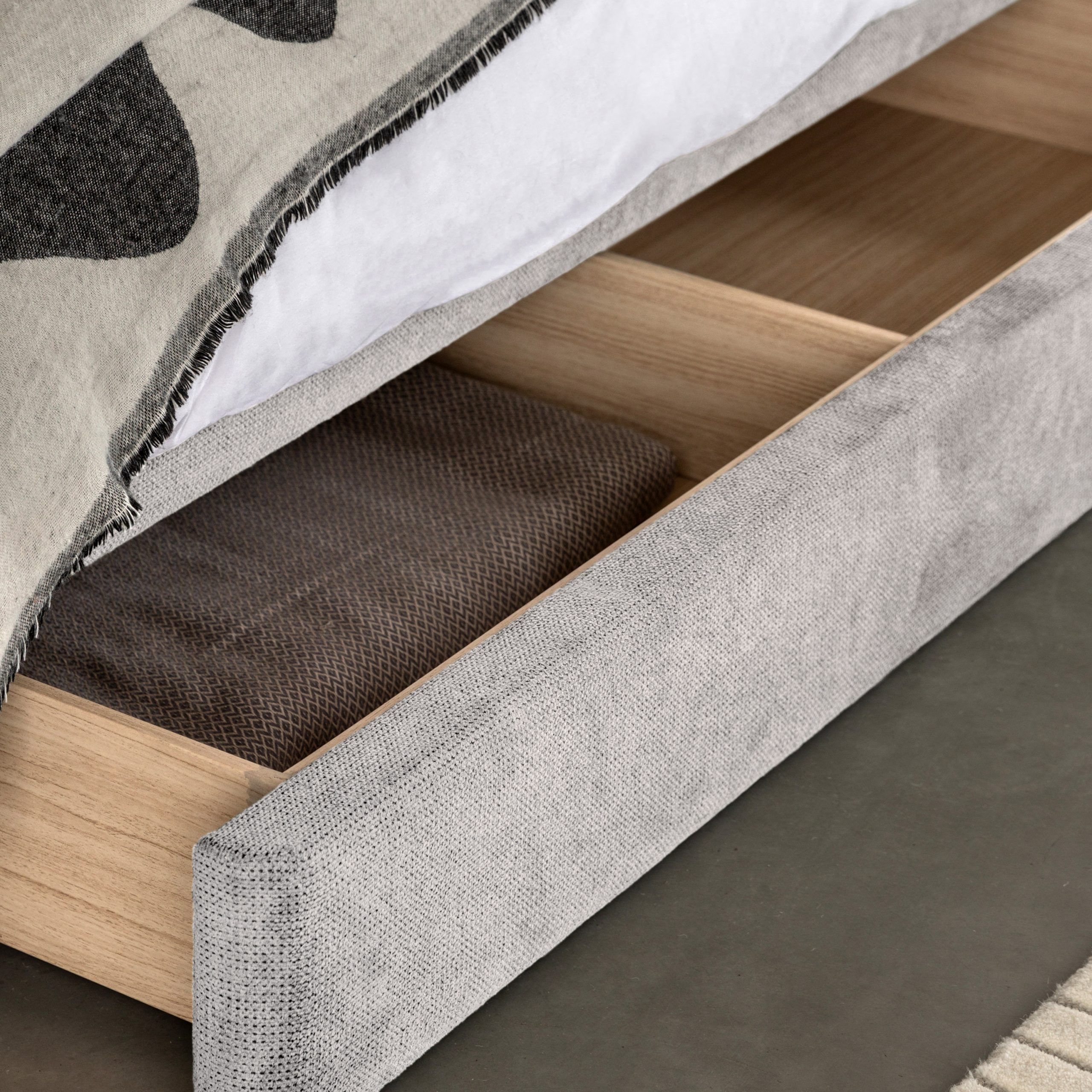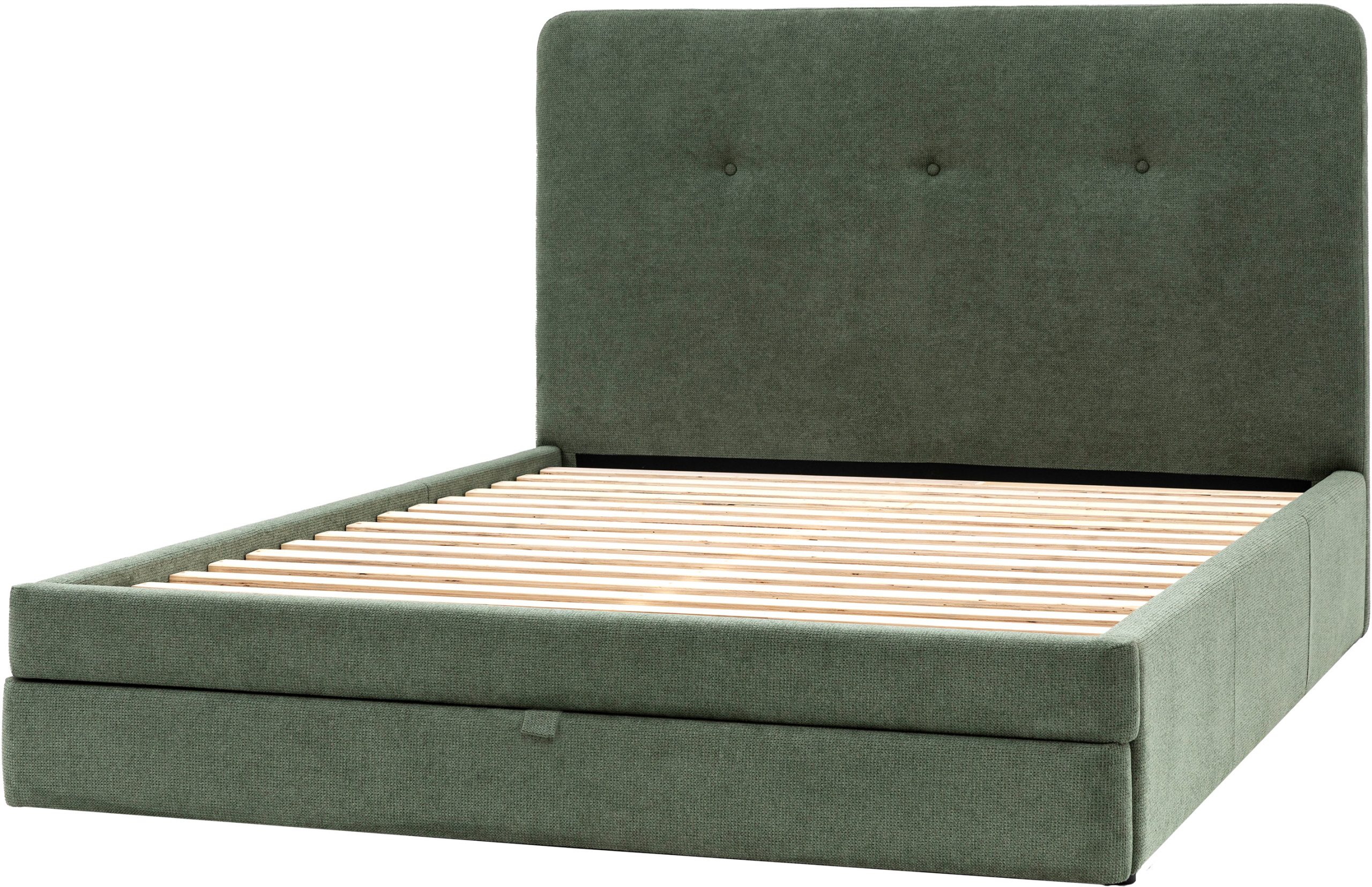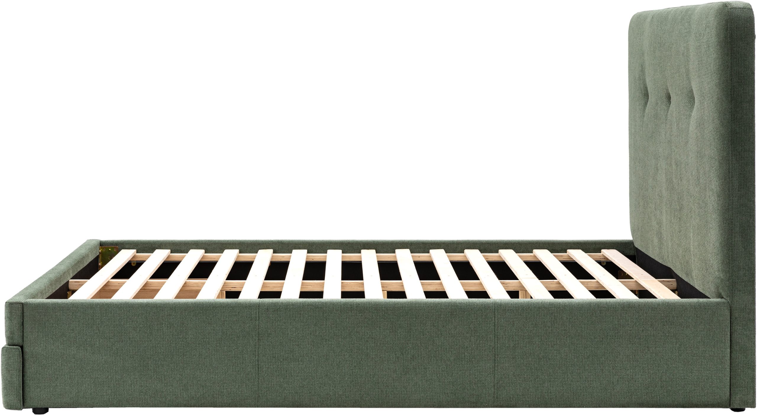 With its simple classy design and lovely green fabric, this beautiful kingsize bedstead would suit a wide range of interiors. The headboard has softly rounded corners and button detailing to give elegant style, and the base features two drawers to give storage space for added practicality. Also available in taupe fabric and as a double bedstead.