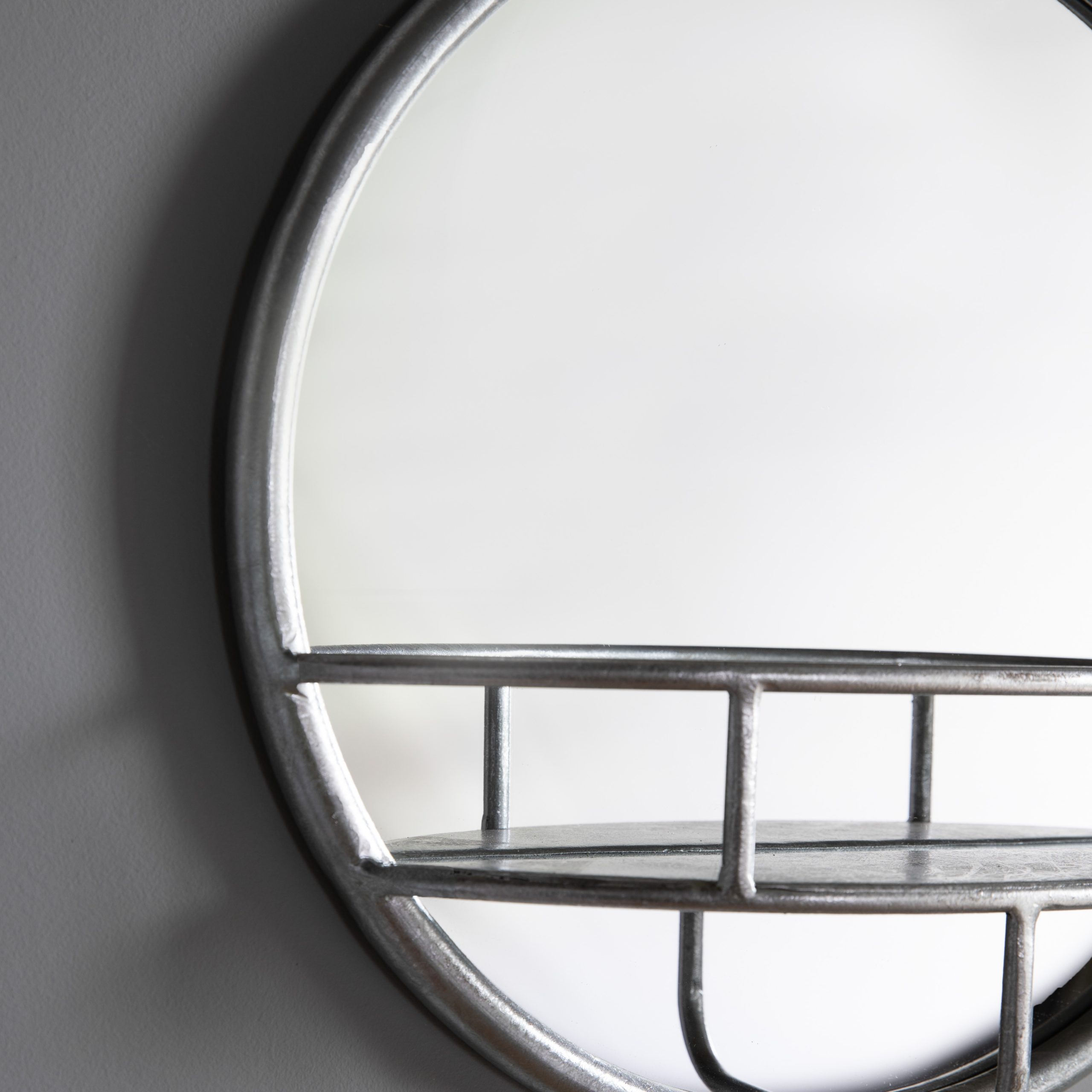 Compact design mirror with a unique metal frame and protruding shelf, for added practicality, in a silver finish.