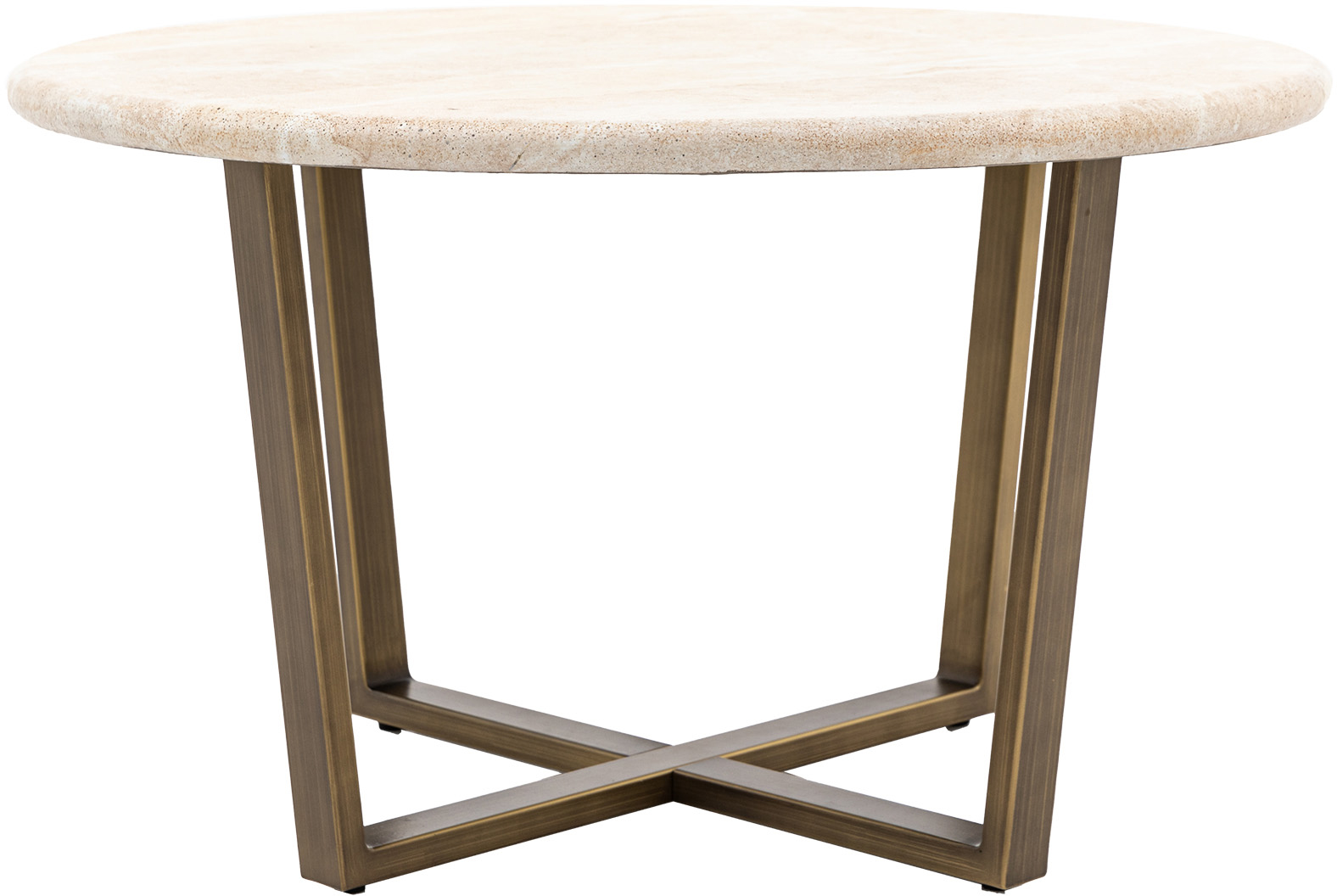 Gallery Direct Moderna Round Coffee Table Add a touch of sophisticated elegance to a room with this lovely coffee table. The top features the most amazing travertine faux finish which is created with the latest state of the art technology to give the look and feel of the real thing but without the weight and technical difficulties. The faux travertine pairs beautifully with the metal base which has a classy bronzed brass finish, to give an understated luxury style, perfect for any classic modern interior. Matching items also available.