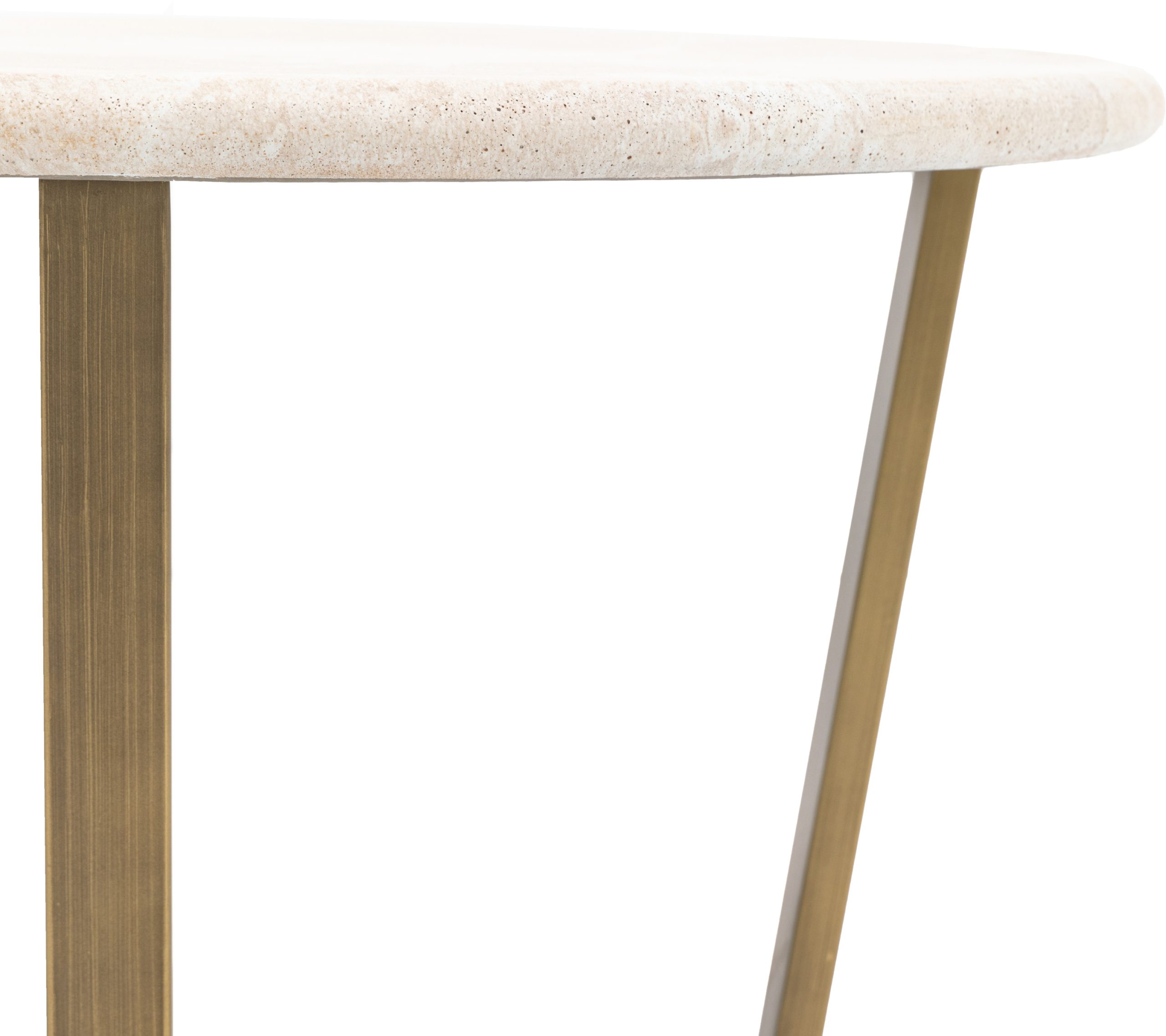 Add a touch of sophisticated elegance to a room with this lovely coffee table. The top features the most amazing travertine faux finish which is created with the latest state of the art technology to give the look and feel of the real thing but without the weight and technical difficulties. The faux travertine pairs beautifully with the metal base which has a classy bronzed brass finish, to give an understated luxury style, perfect for any classic modern interior. Matching items also available.