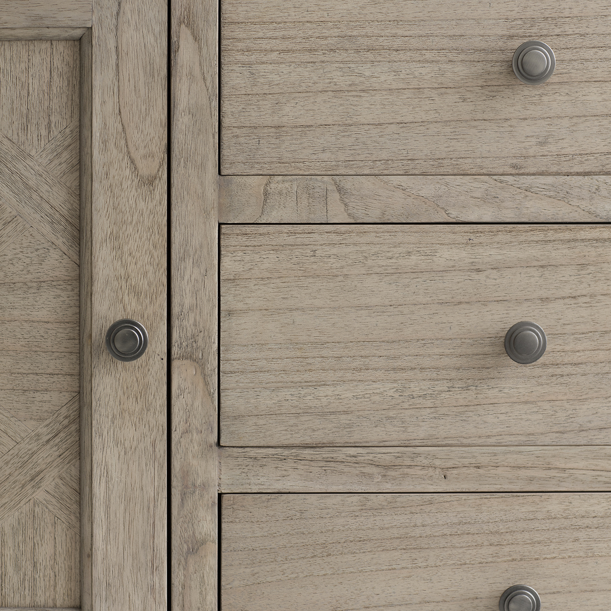 With a nod towards the French colonial style this practical sideboard is made from Mindy ash and features parquet inlaid veneer work in a lightly brushed natural finish. Each shelf contains an adjustable shelf.