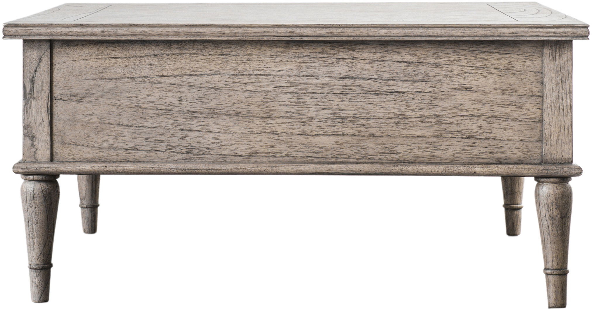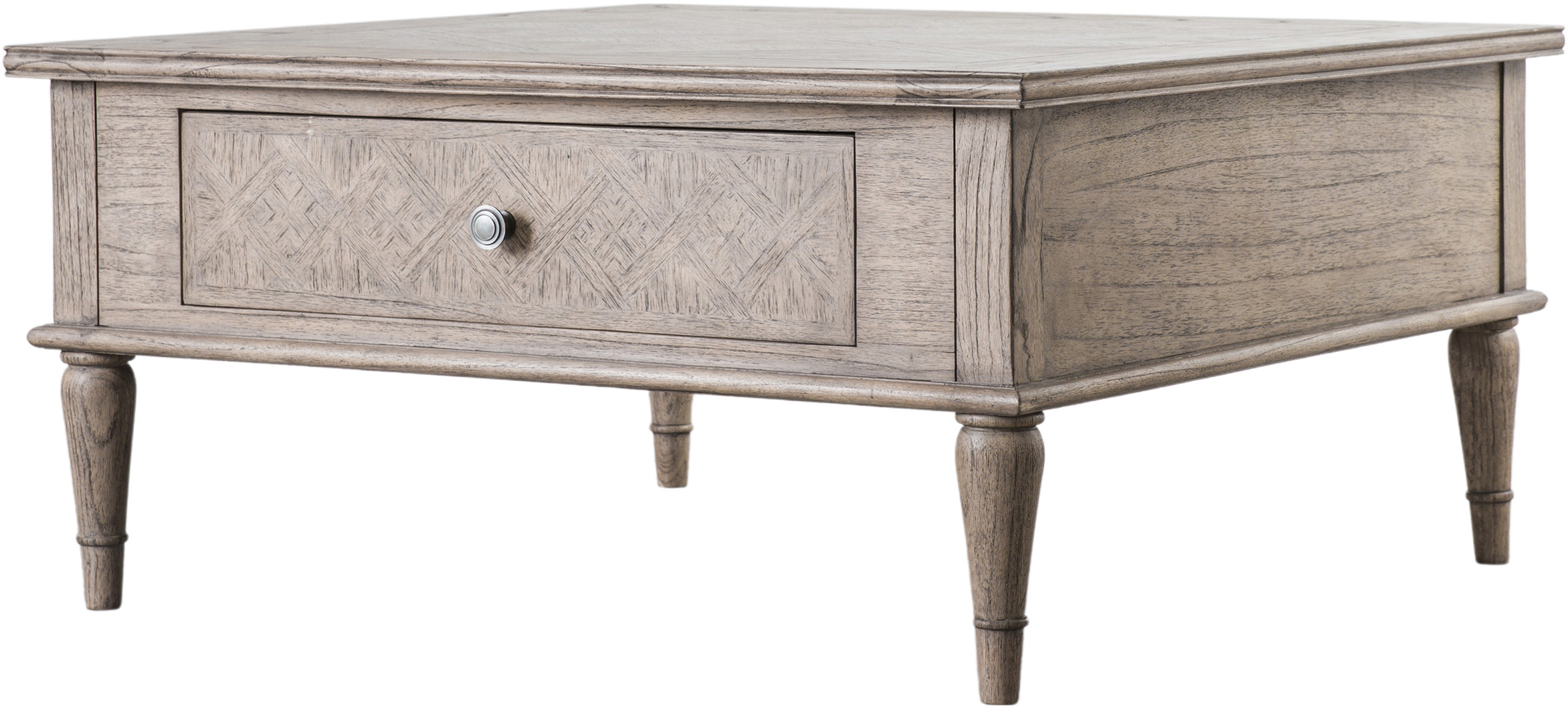 This square 2 drawer coffee table adds practical style to a living room. The two drawers, one on either side of the table, are ideal for helping to keep tidy. The top and drawer fronts feature the signature parquet-style design, whilst elegant turned legs add a sophisticated finish to the table.