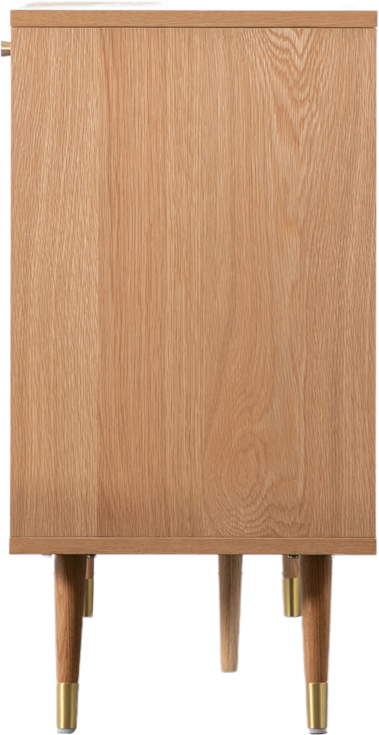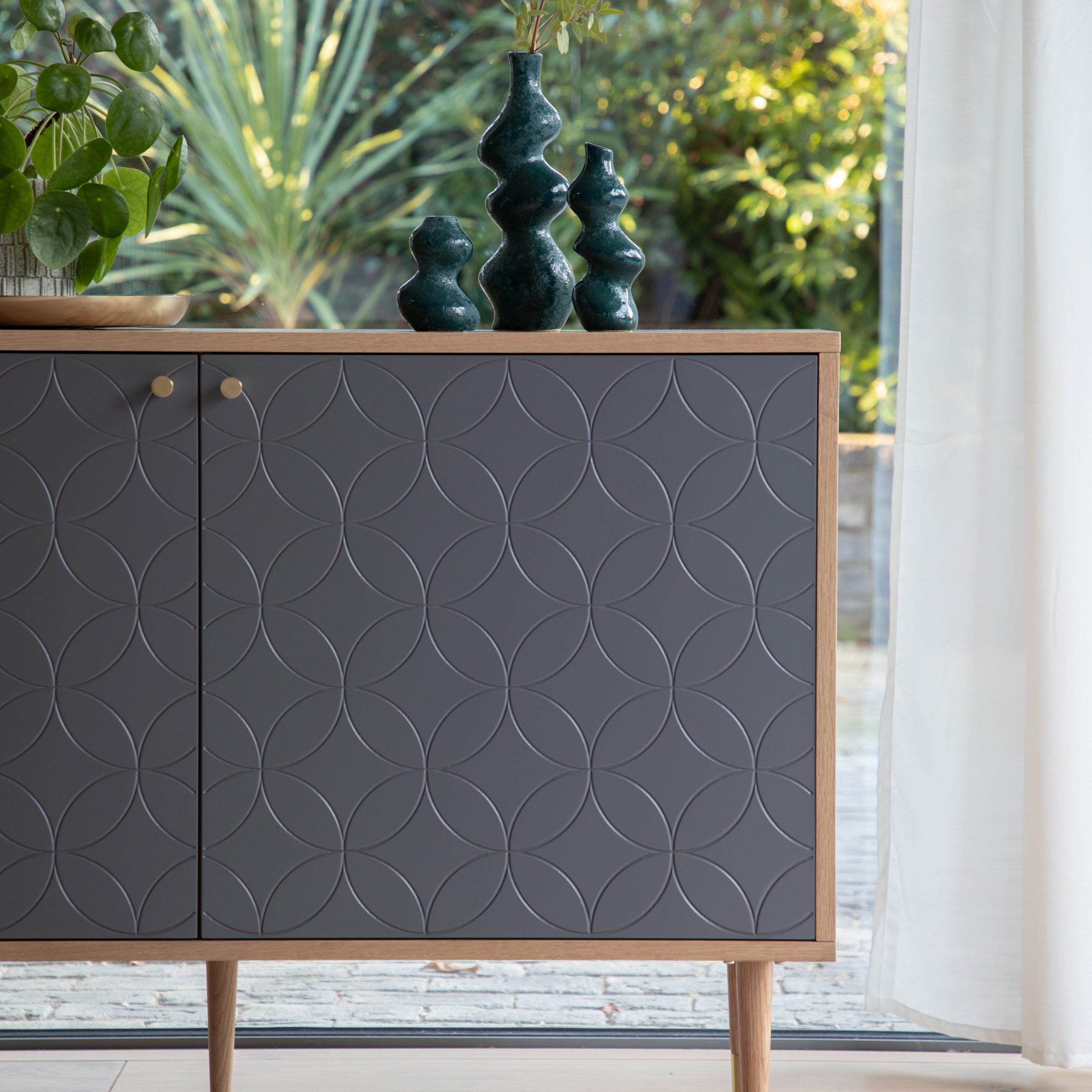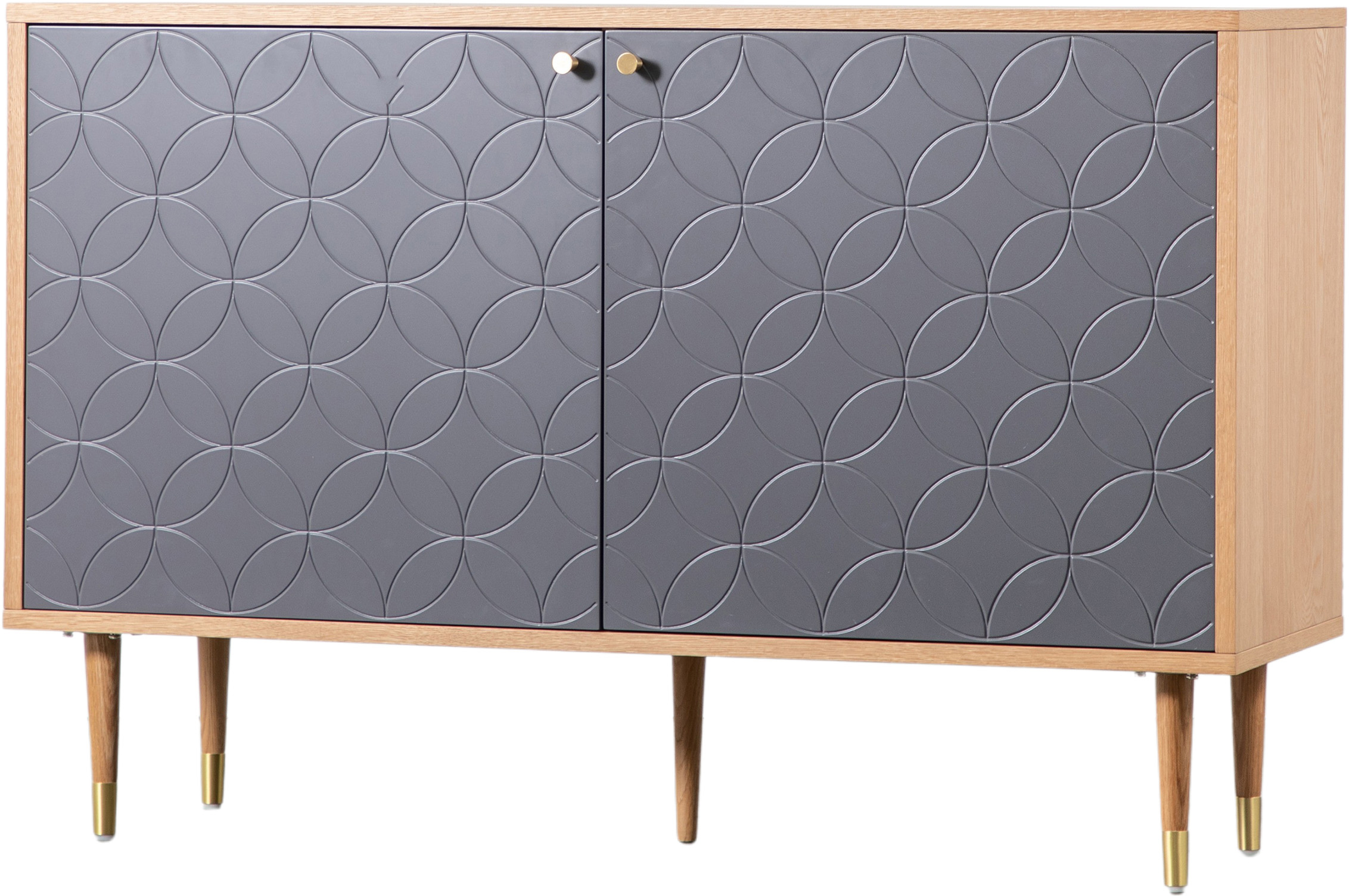 This lovely 2 Door Cabinet makes an unusual eye-catching feature piece, with a combination of a grey painted finish and natural oak veneer. The cabinet combines colour and shape to great effect, with a routed geometric circular pattern, reminiscent of Bauhaus design, on the painted doors. Brass handles on the cupboard doors are complemented by brass socks on the solid oak legs. The cabinet is also available in white, and the collection also includes other matching and coordinating pieces.