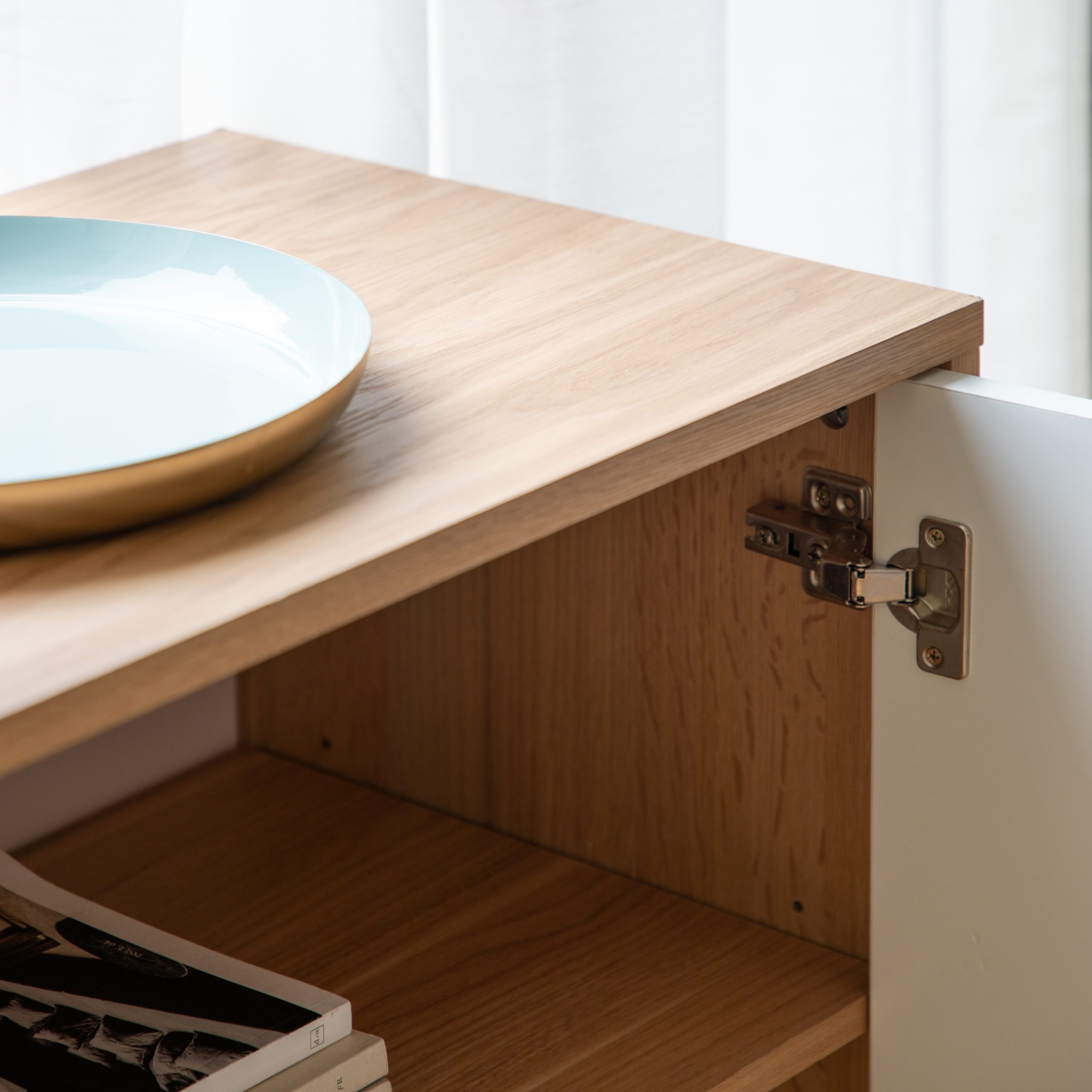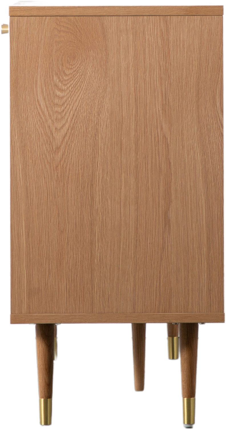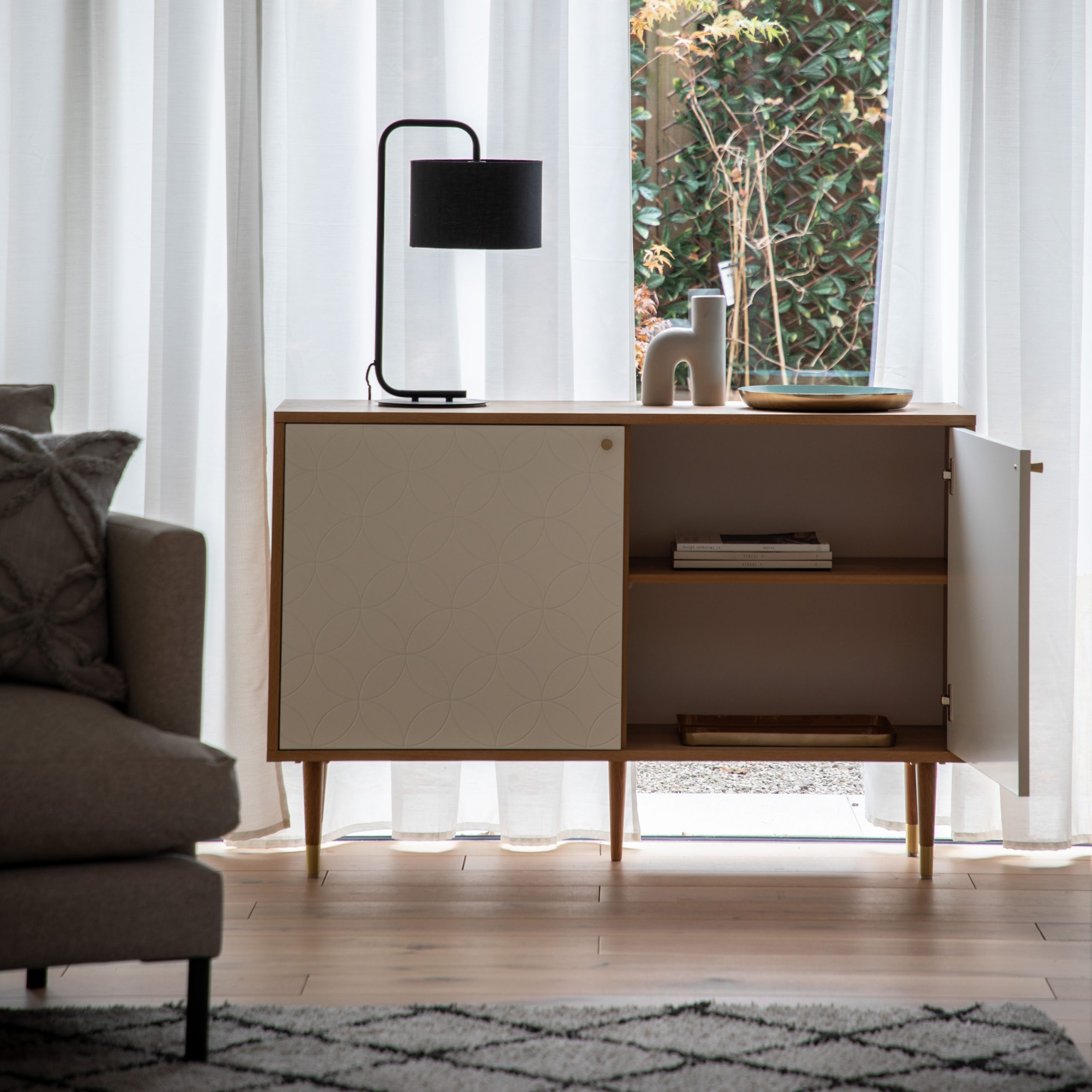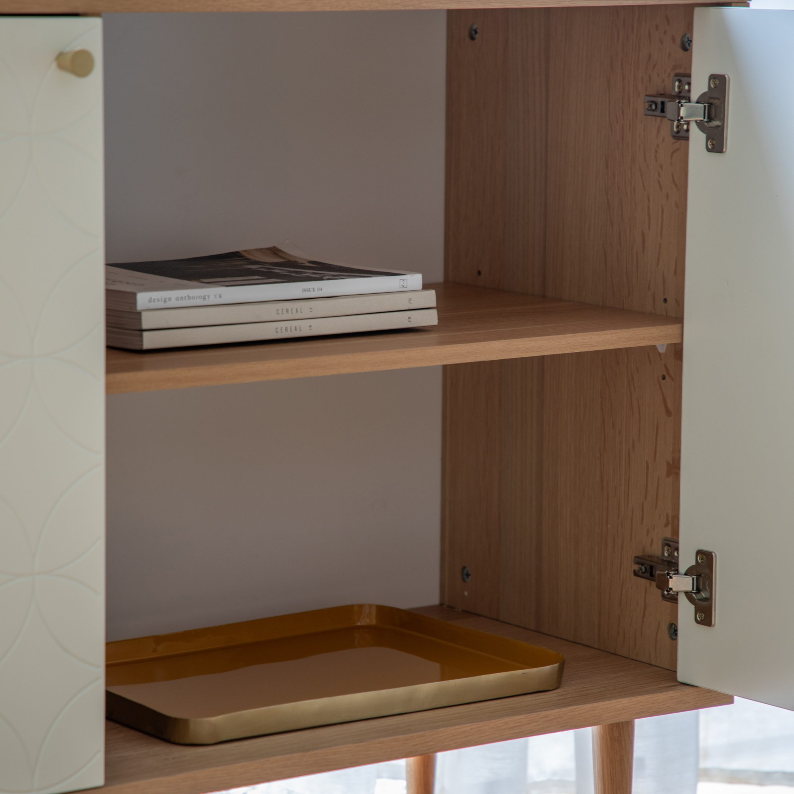 This lovely 2 Door Cabinet makes an unusual eye-catching feature piece, with a combination of a white painted finish and natural oak veneer. The cabinet combines colour and shape to great effect, with a routed geometric circular pattern, reminiscent of Bauhaus design, on the painted doors. Brass handles on the cupboard doors are complemented by brass socks on the solid oak legs. The cabinet is also available in grey, and the collection also includes other matching and coordinating pieces.