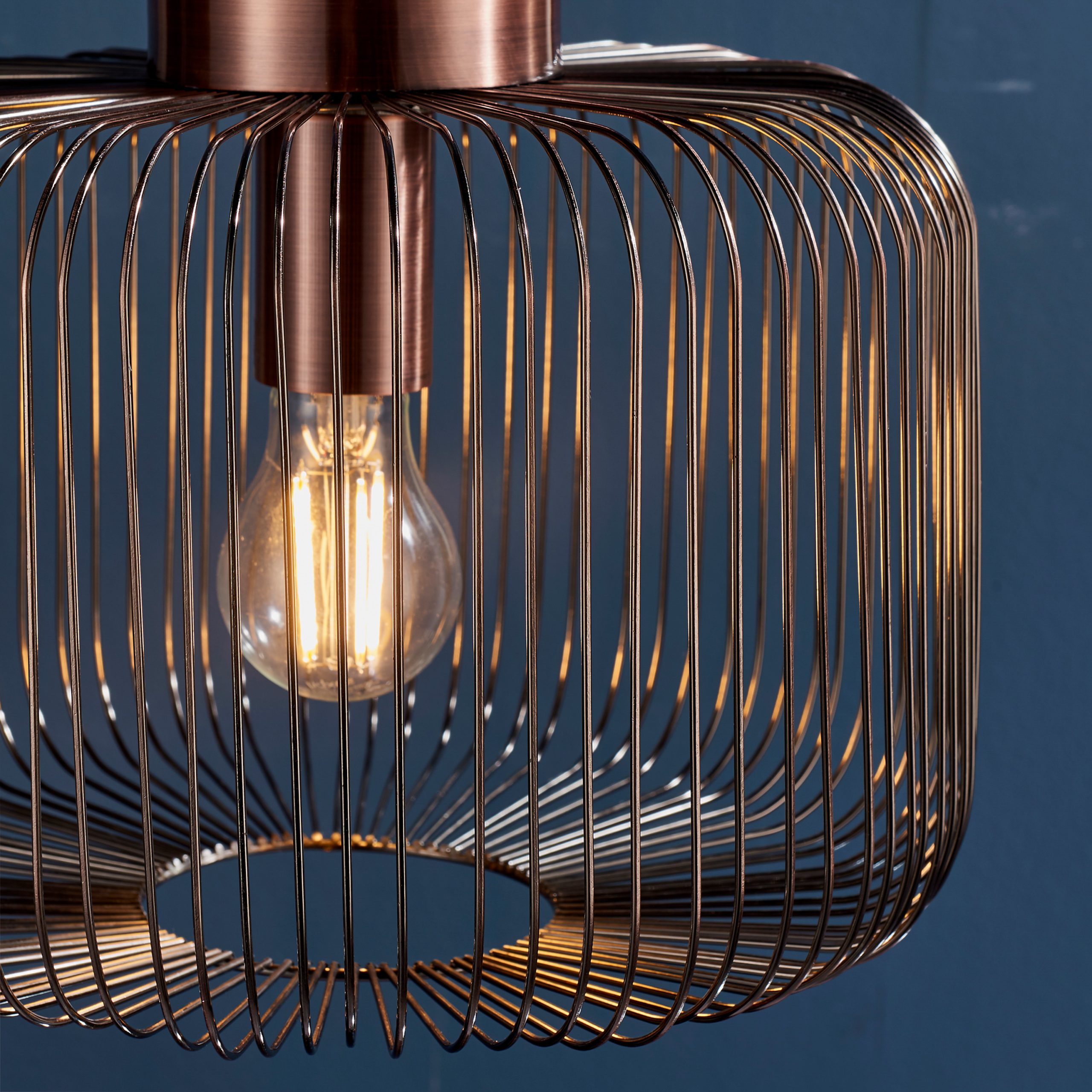 This metal caged shade finished in an antique copper effect plate puts a modern twist on vintage and industrial style lighting. Works well with a filament bulb. Height is adjustable at time of fitting and suitable for use with LED lamps. Available in a choice of shapes