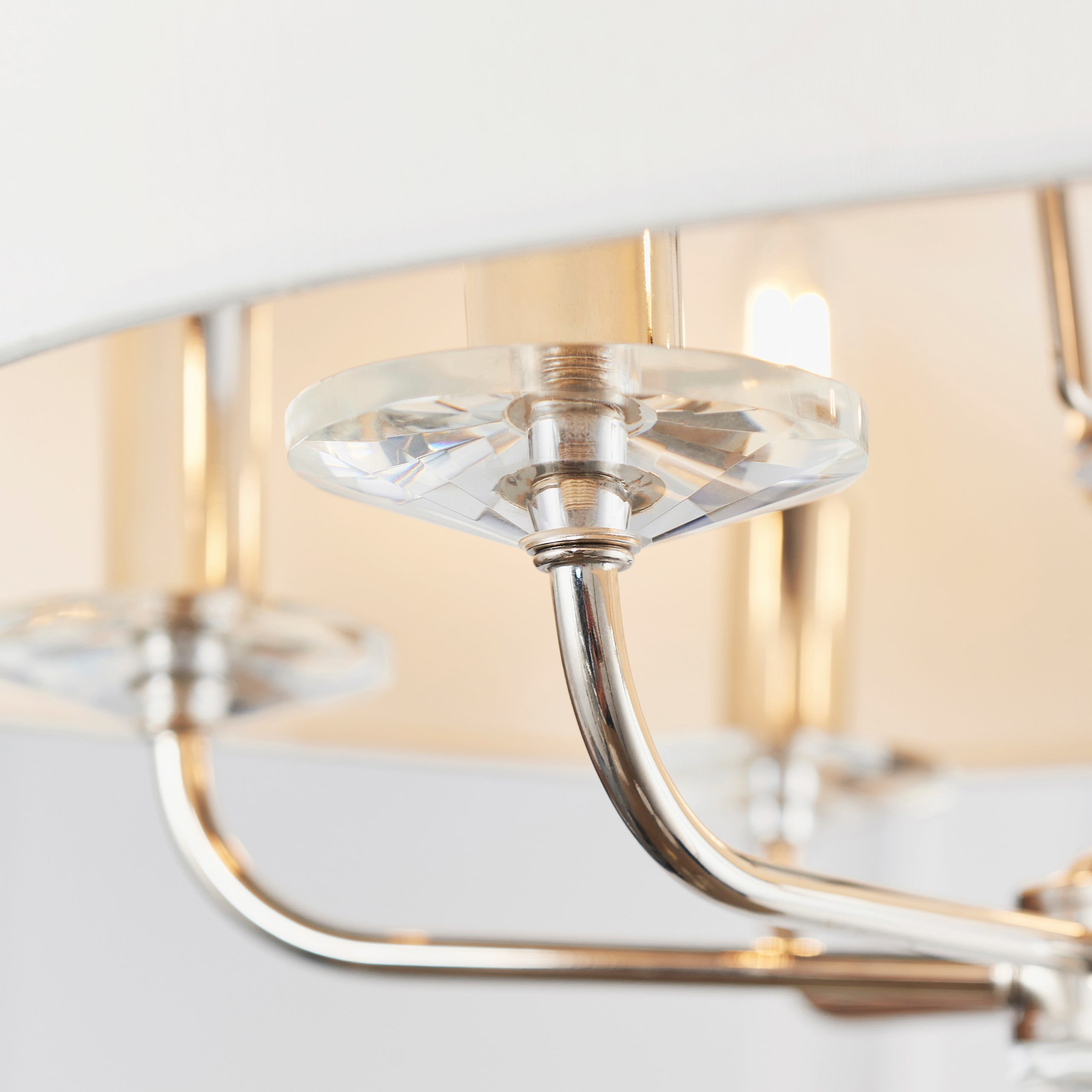 This 6 light ceiling pendant is finished in a bright nickel plate. The arms are complimented with a touch of crystal and the fitting is topped with a narrow, vintage white, faux silk shades. Height is adjustable, dimmable and suitable for use with LED lamps. Matching items available