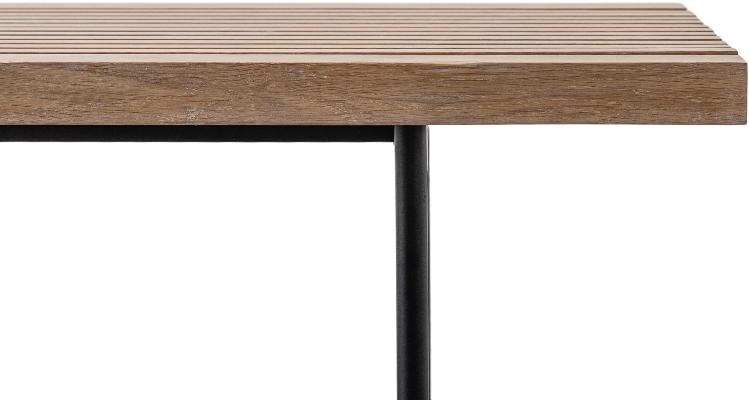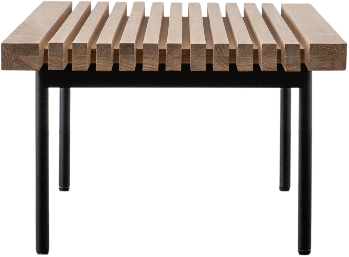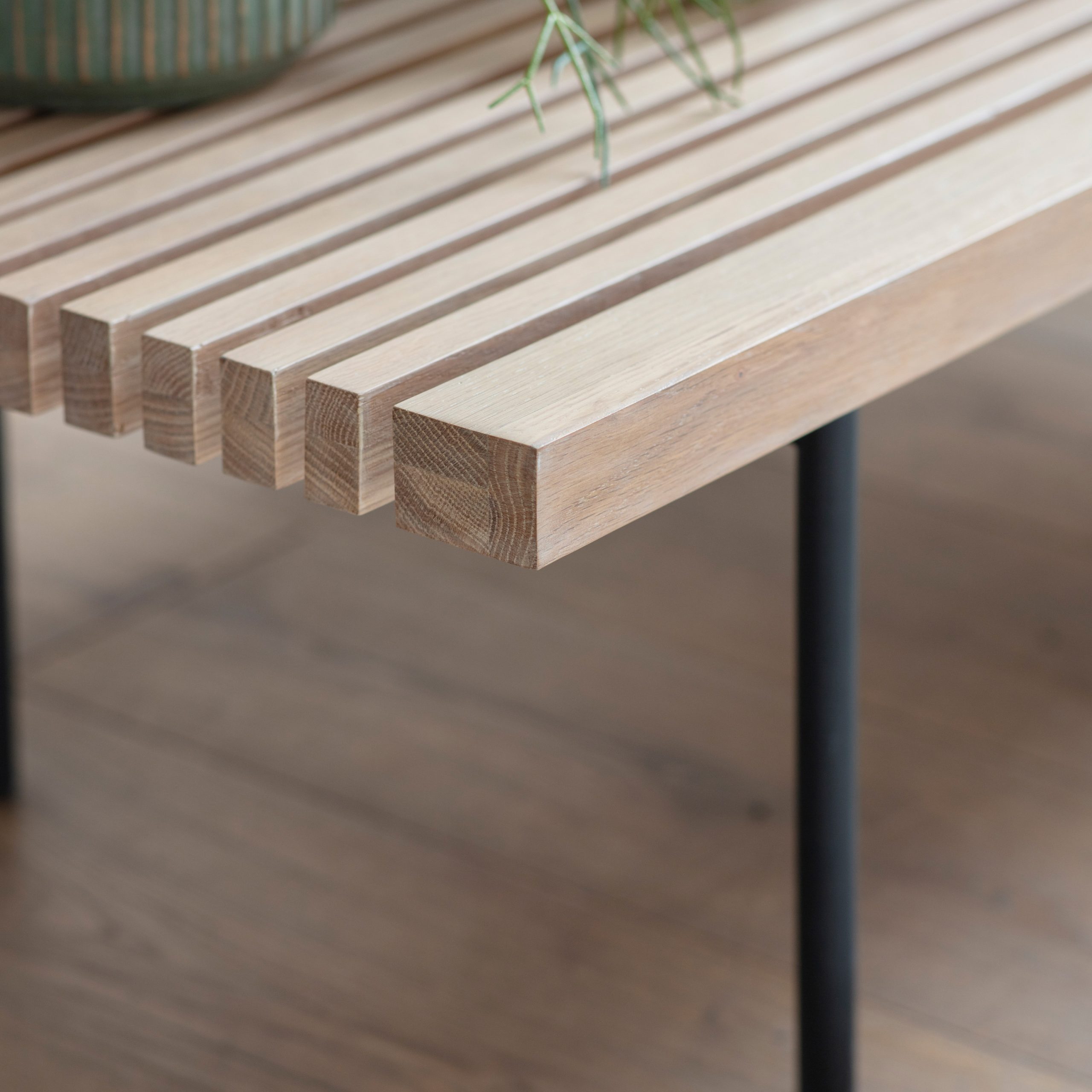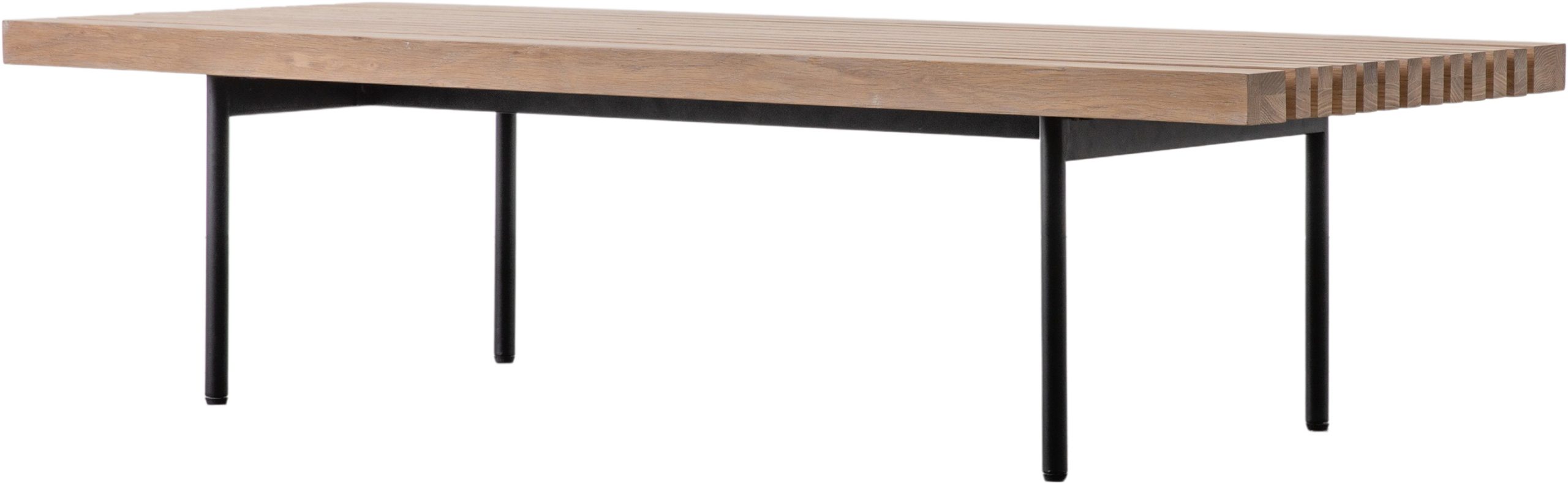 This coffee table features a stylish oak top, with a combination of slats and routing to create a stunning look. Slim black metal legs add the finishing touch.