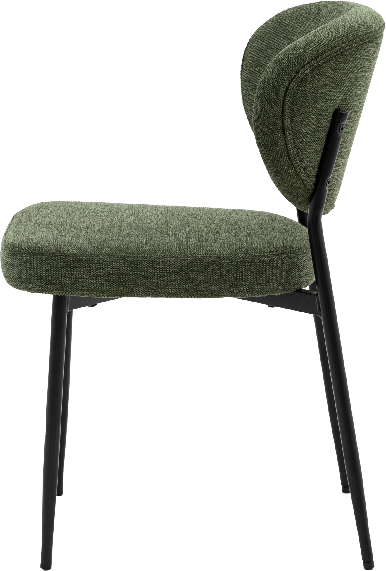 Gallery Direct Oppo Dining Chair Green (2pk) The Gallery Direct Oppo Dining Chair Green is a stylish and comfortable addition to any dining space. Its unique oval-shaped backrest and sleek black metal legs create a modern and eye-catching look. The soft, upholstered seat provides comfort and style, while the dark grey fabric adds a touch of sophistication.
