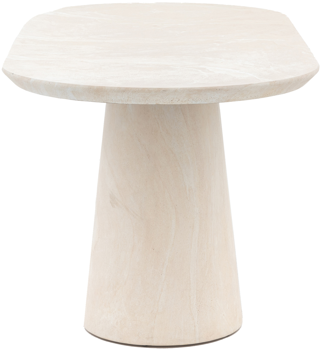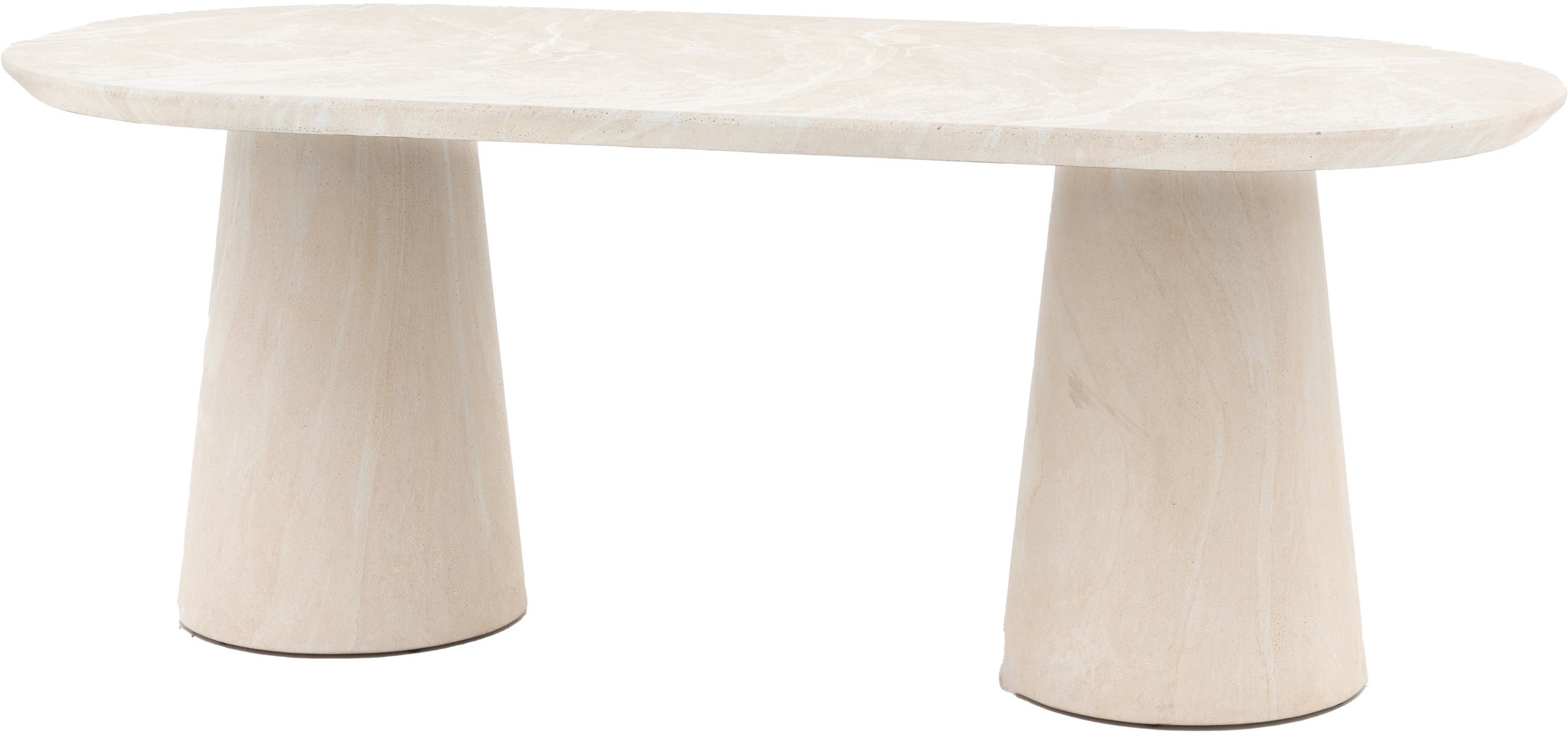 The Gallery Direct Pedra Oval Dining Table Travertine is a striking piece of furniture that combines modern design with raw materials. Its sleek, oval tabletop is crafted from durable concrete with a unique Travertine finish, while the two sturdy pedestal legs provide a solid base. This unique combination of materials creates a contemporary and industrial look that is perfect for both indoor and Outdoor dining spaces.