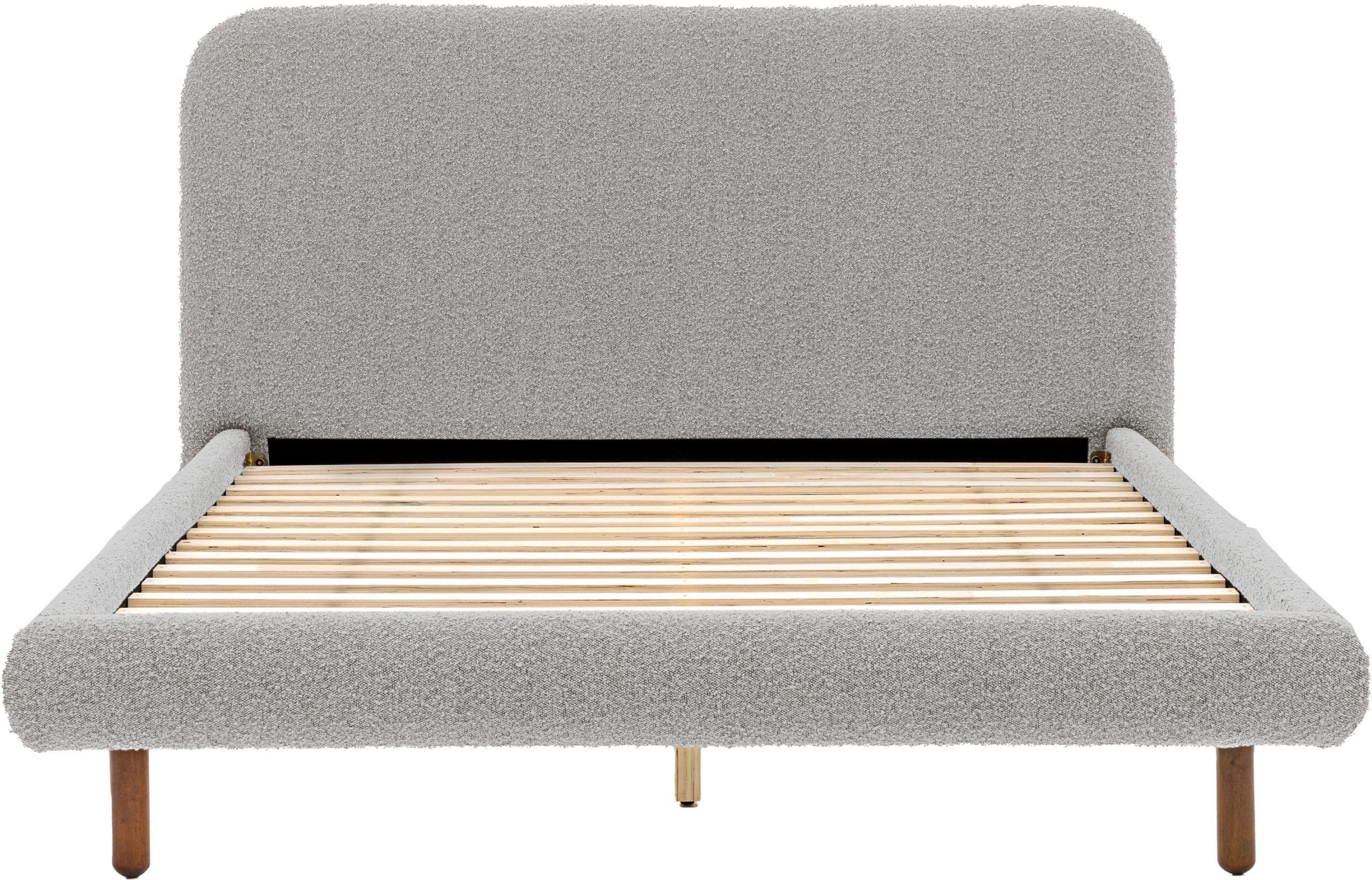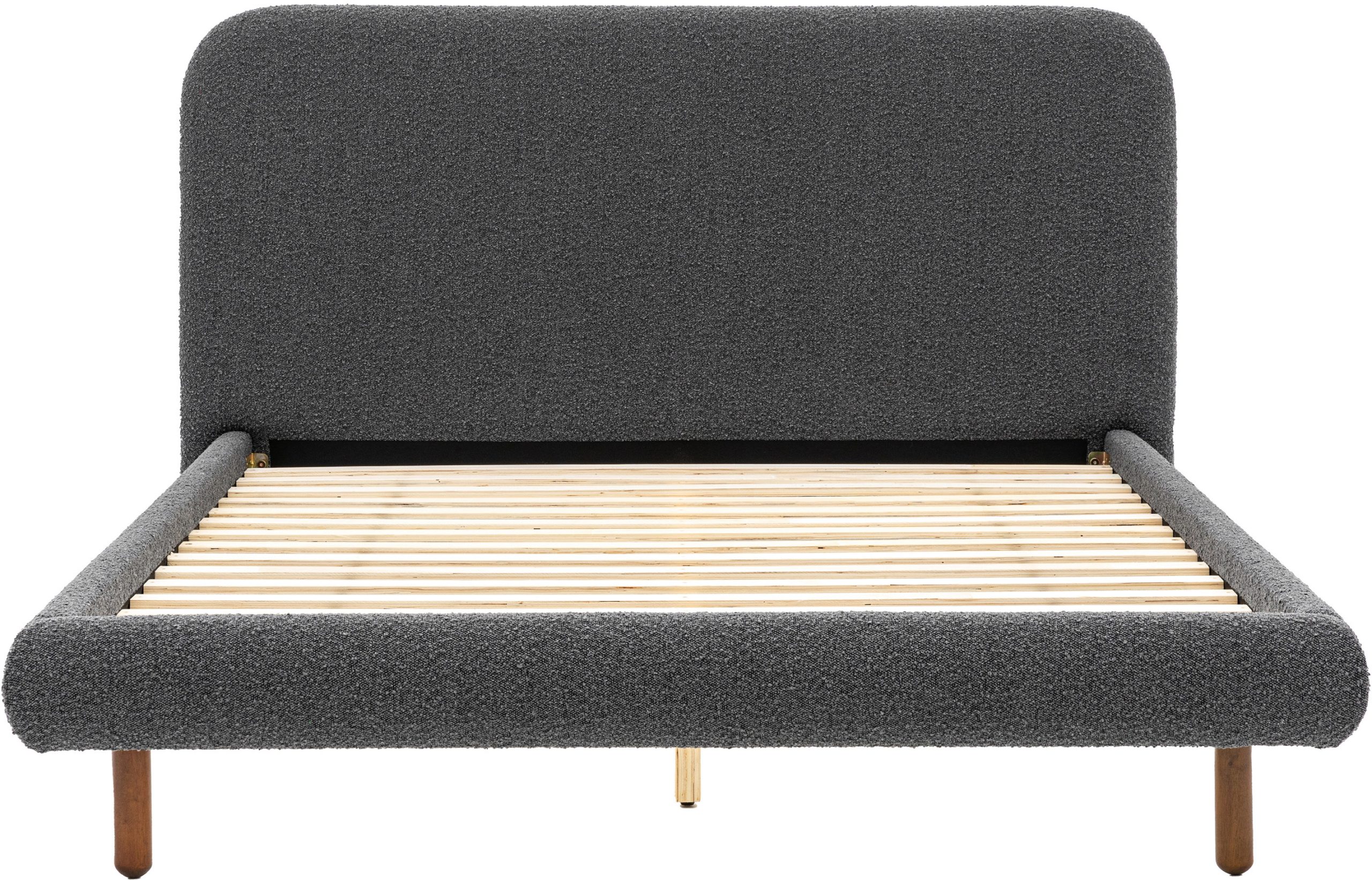 Upholstered in dark grey boucle fabric with an intriguing bobble texture this modern double bedstead will update any bedroom. The slim wooden legs and gently curved headboard add to the contemporary feel, making this bedstead the perfect addition to any modern home. Also available in other sizes and colours.