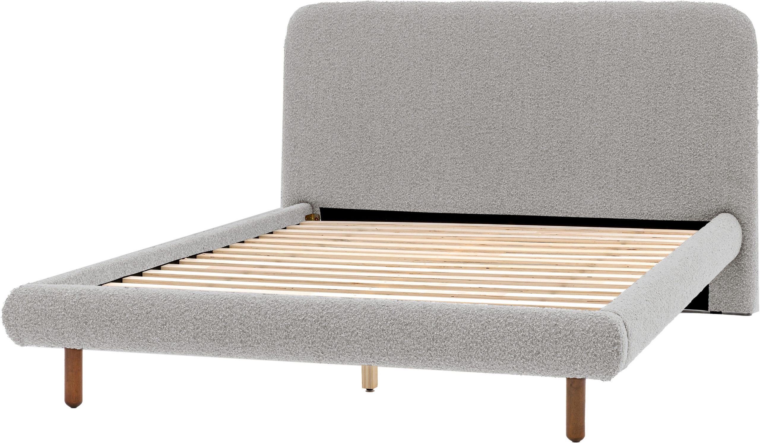 Upholstered in light grey boucle fabric with an intriguing bobble texture this modern double bedstead will update any bedroom. The slim wooden legs and gently curved headboard add to the contemporary feel, making this bedstead the perfect addition to any modern home. Also available in other sizes and colours.