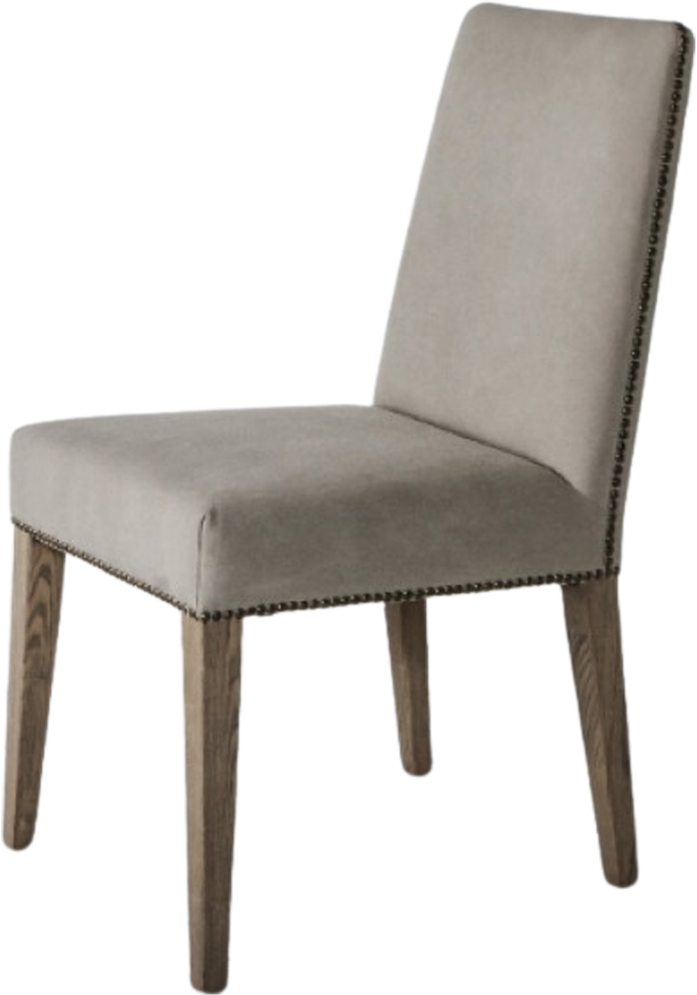 Set of 2 upholstered chairs that will fit seamlessly in both traditional and modern dining environments. Upholstered in natural Cement linen and finished with brass hand nailhead trim and angled solid ash legs.