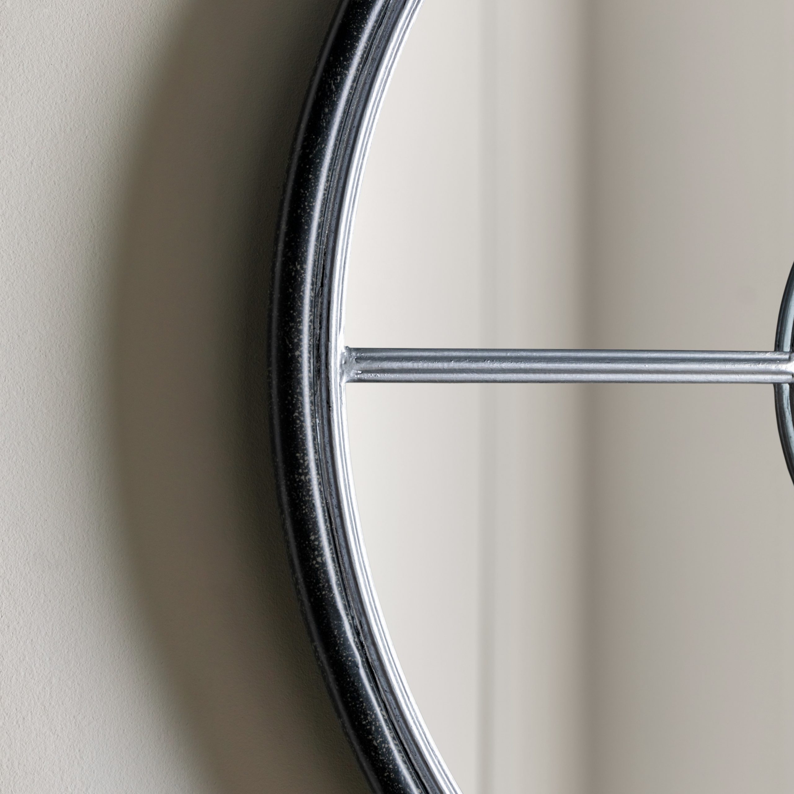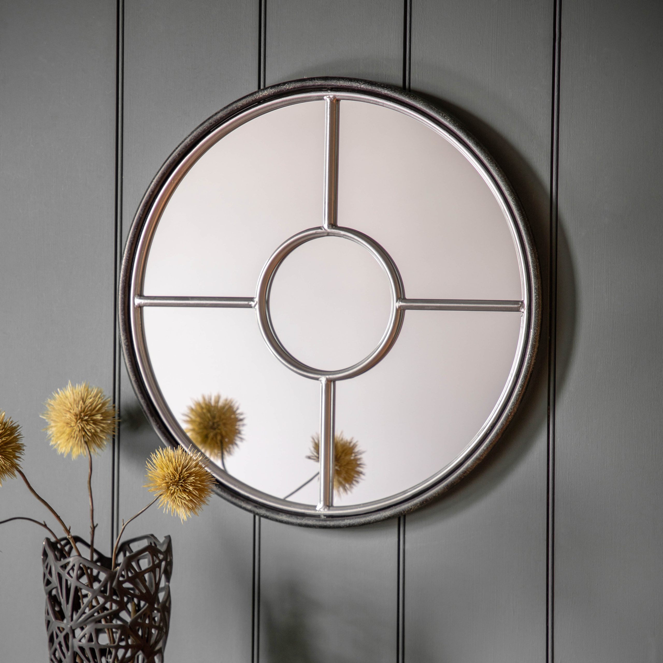 Uniquely designed compact round window mirror, with a stylish black and silver framing. Perfect for an industrial feel in a living space and suitable for smaller walls or hallways.