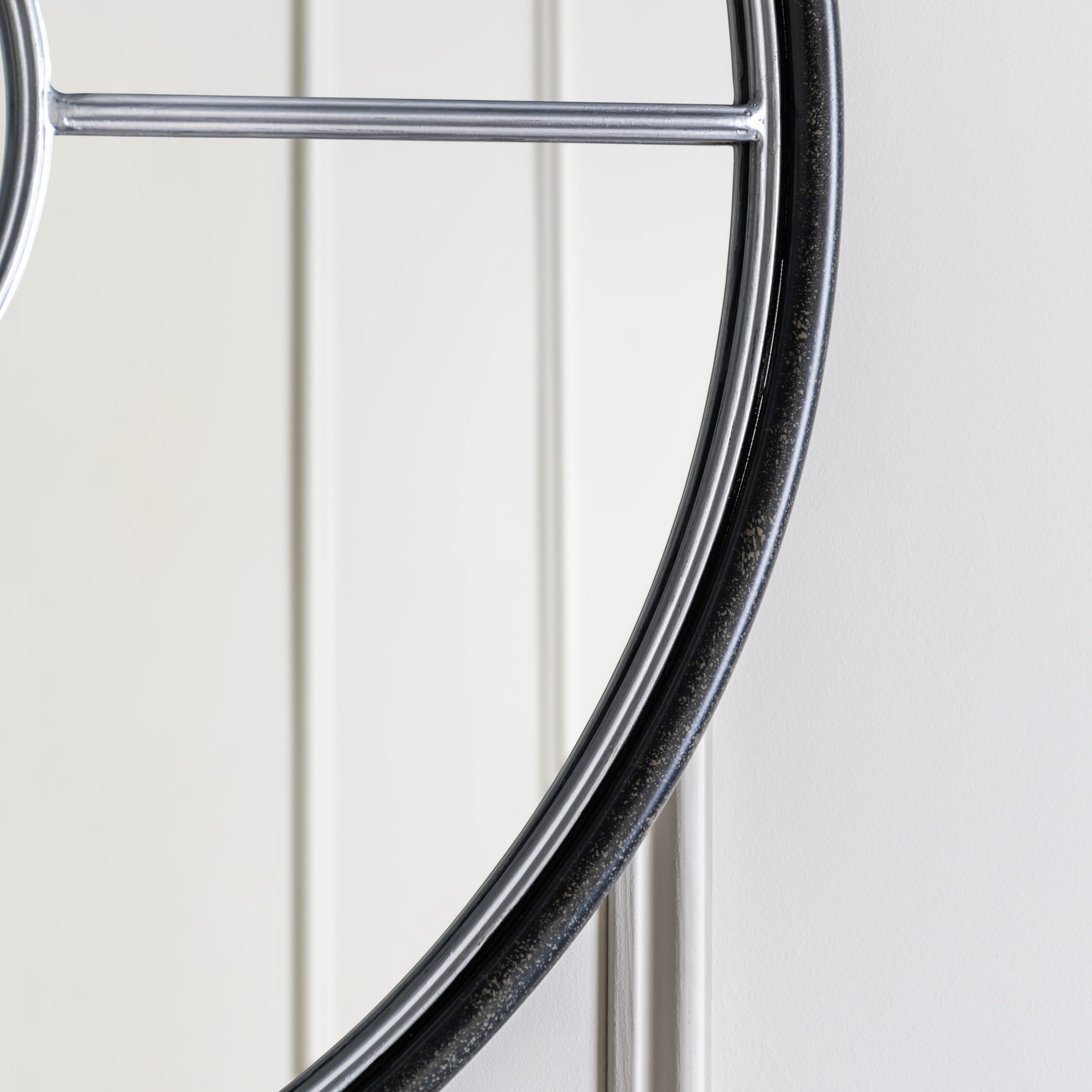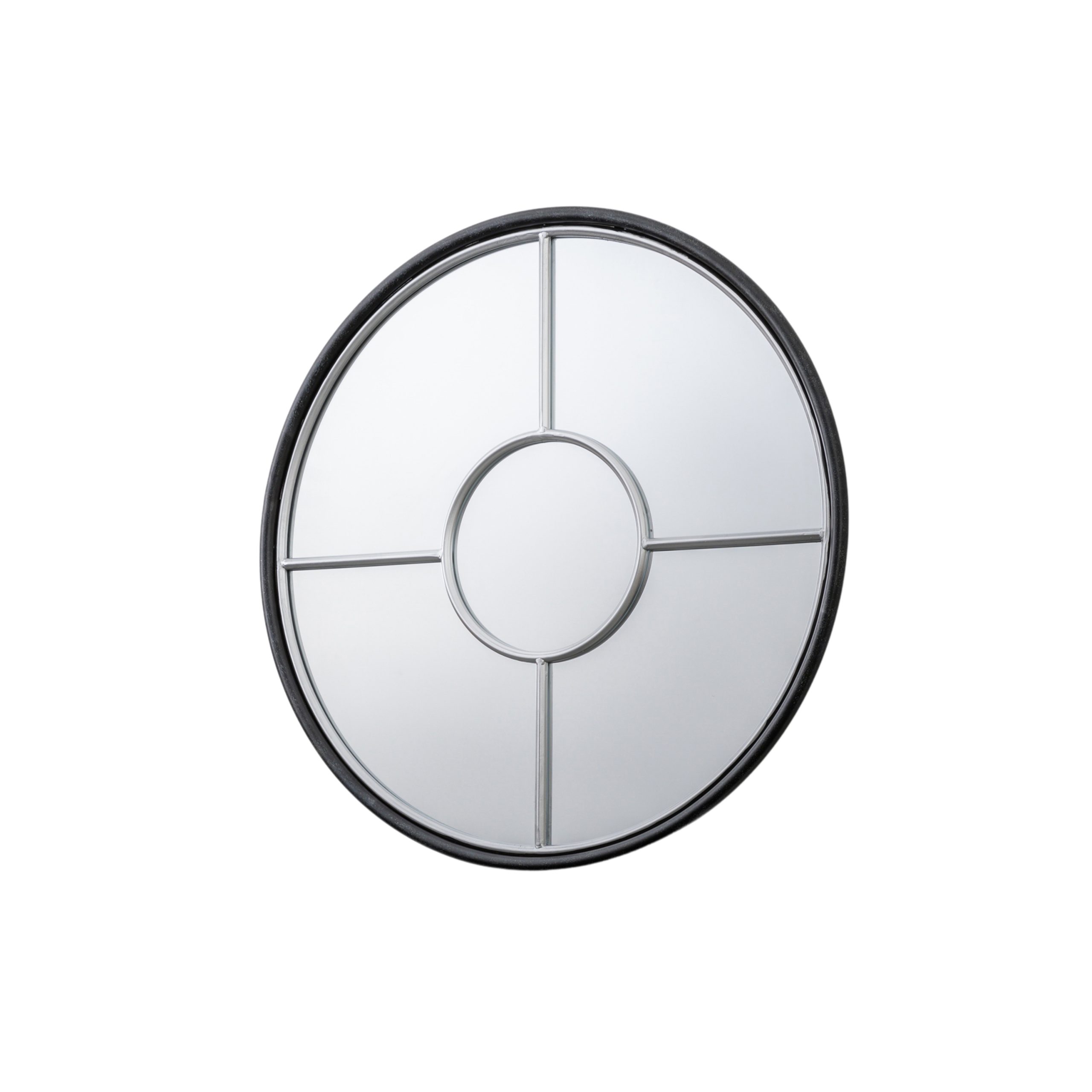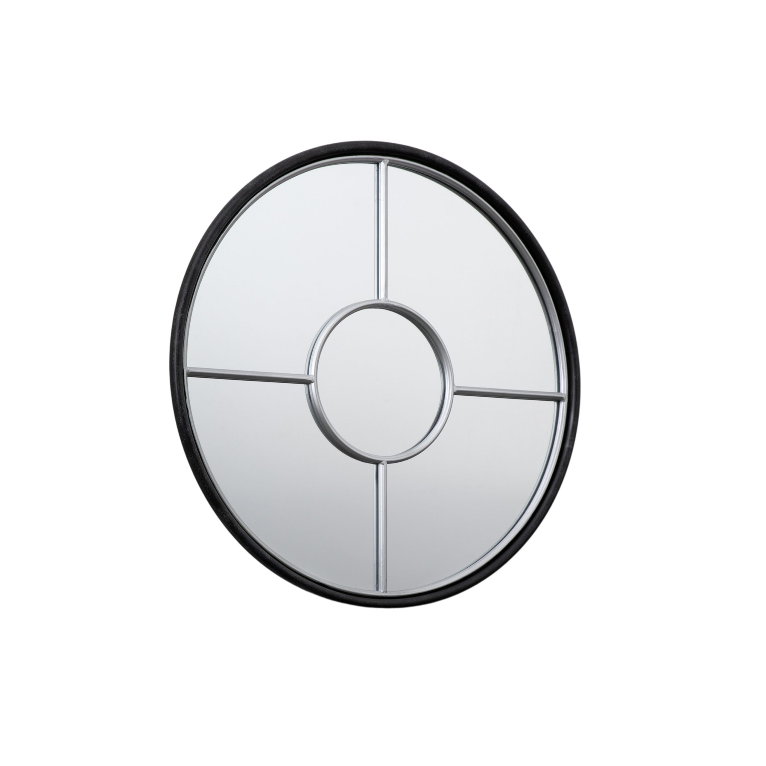 Uniquely designed compact round window mirror, with a stylish black and silver framing. Perfect for an industrial feel in a living space and to unique focal point.