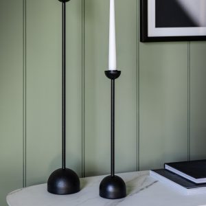 Gallery Direct Roddy Candlestick Small Black Contemporary and modern, this candlestick is elegantly shaped, with the thin black metal stem and hemisphere ends make for a striking candlestick. Pair with the matching larger candlestick for the most impact. Candle not included.