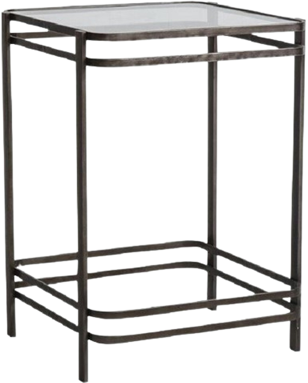 An accent piece, this inlaid glass topped side table has a brushed metal frame
