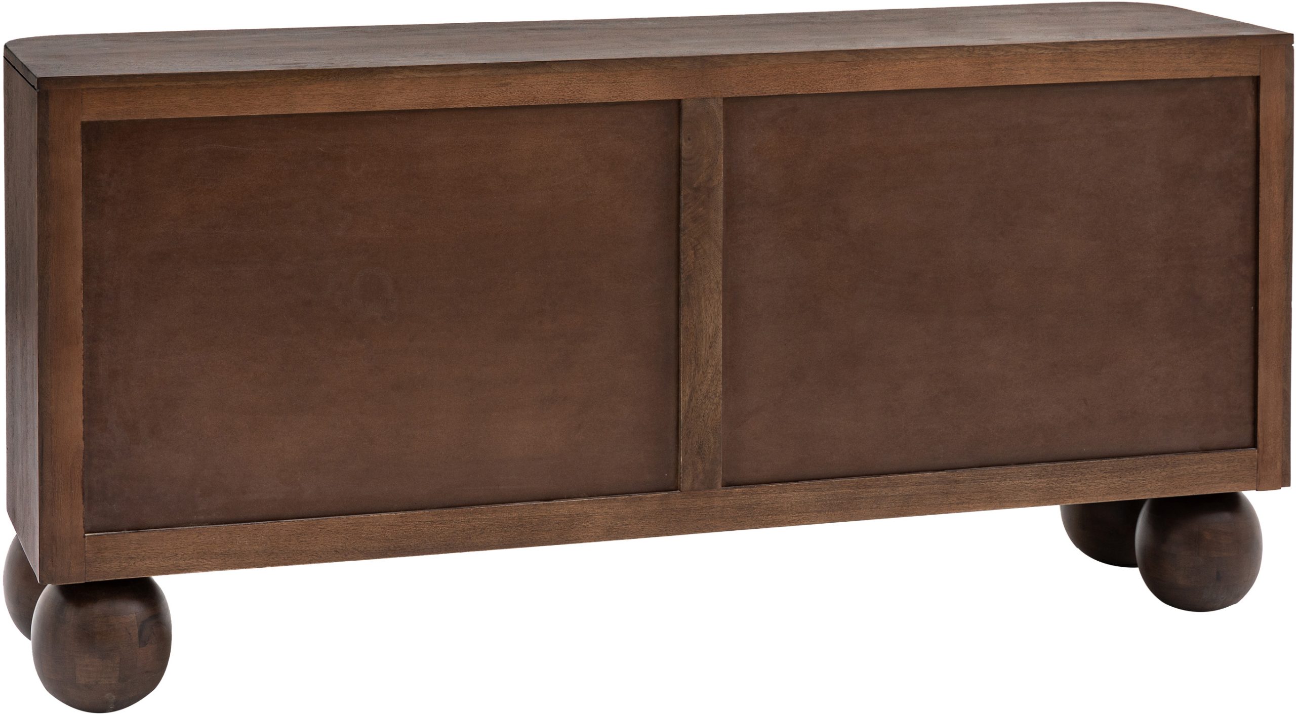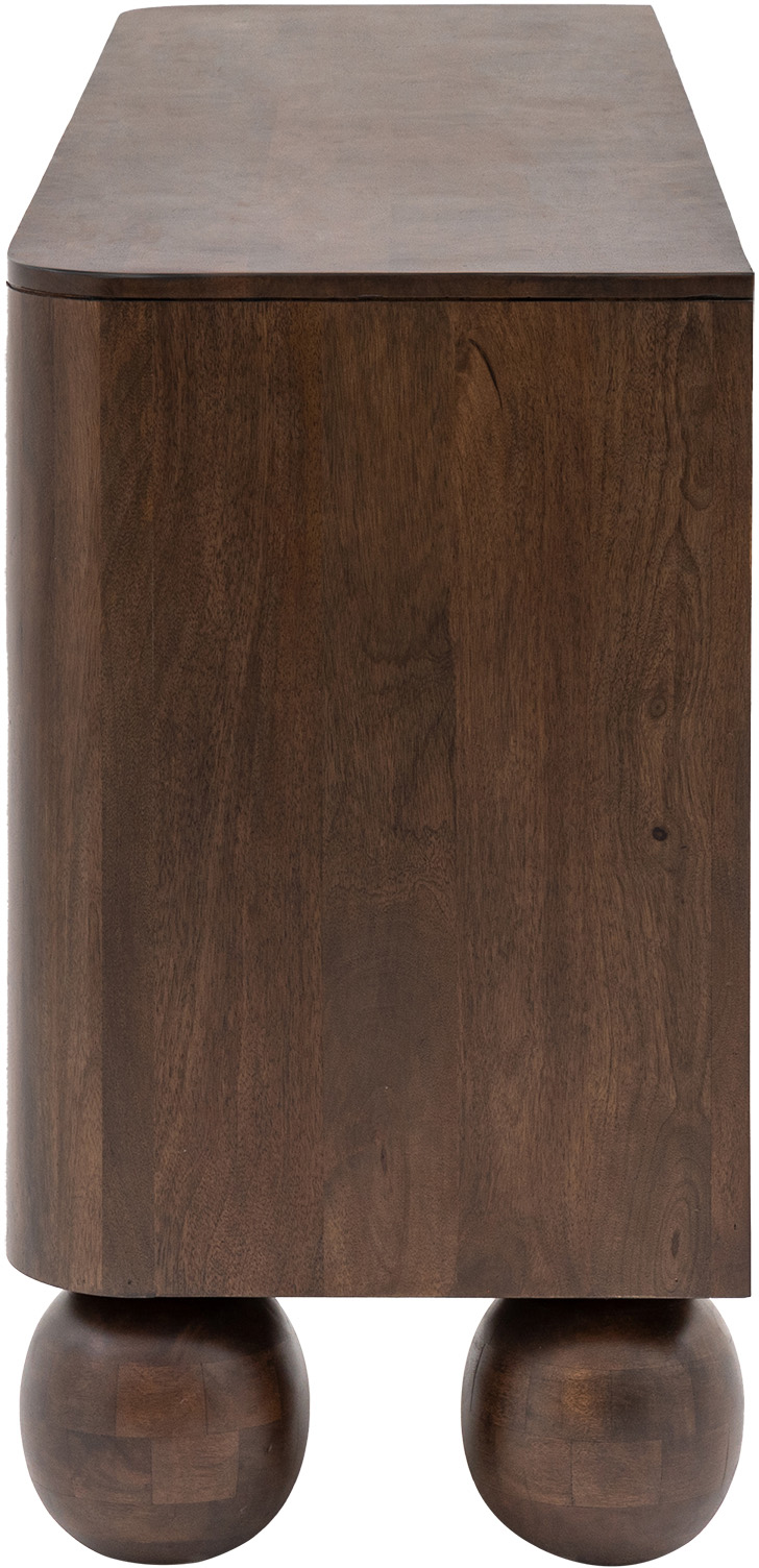 This eye-catching sideboard is crafted using mango wood solids with a rich deep finish. The front corners of the sideboard are gently curved with the elegant slim cut-out handles on the doors curving at the top to echo this. Turned ball feet complete the look to create this dramatic retro piece. Coordinating items are available.