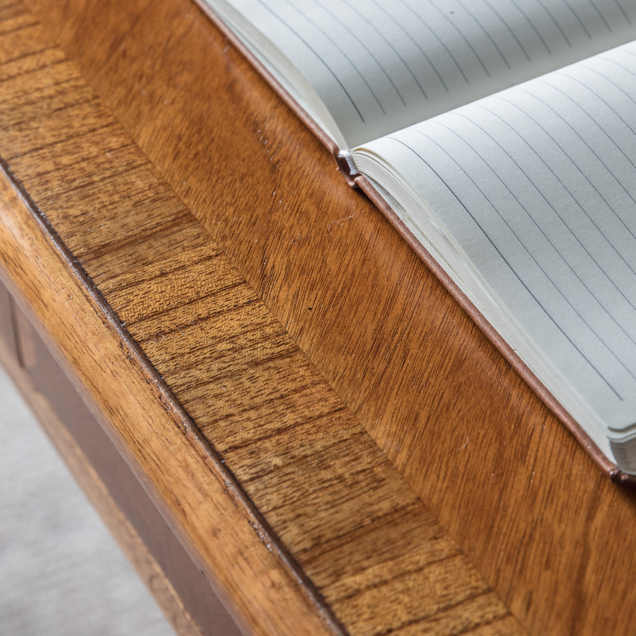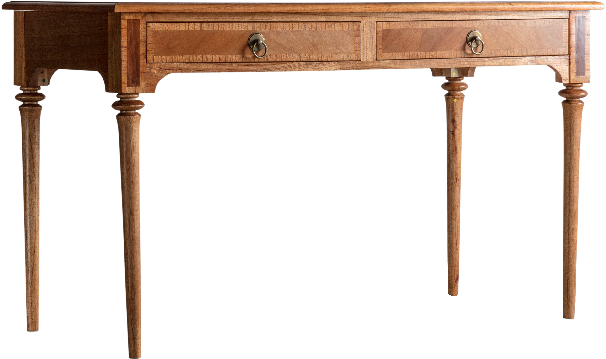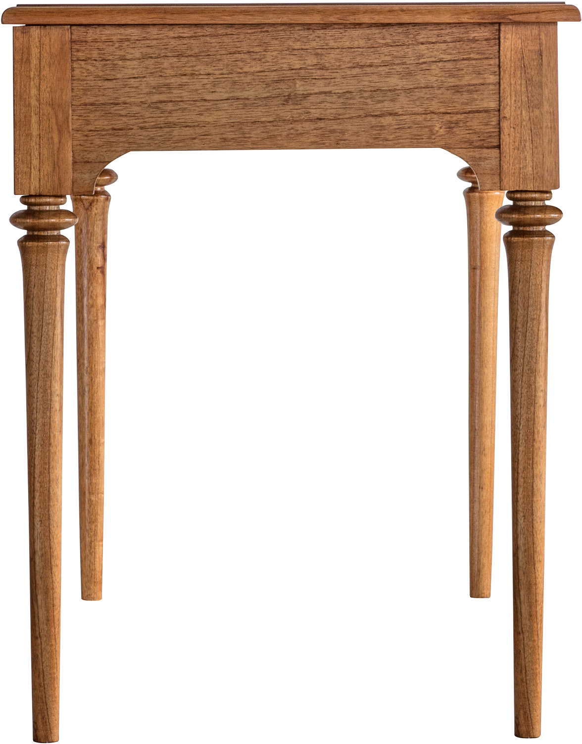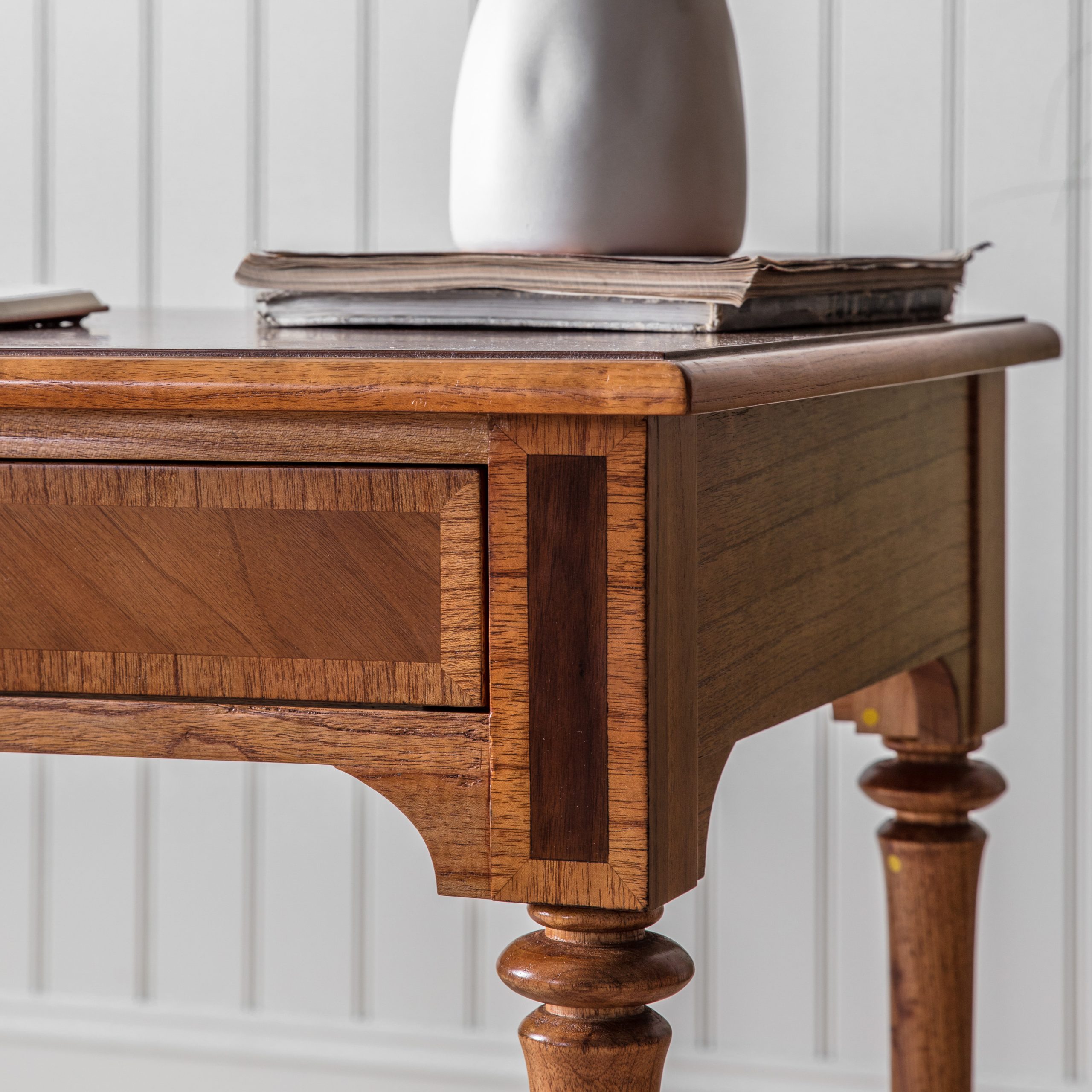Great attention to detail has been given to the design of this desk to create a timeless, classic style. The rich warm tones of the wood are accentuated by the beautiful inlay on the top and on the drawer and top block fronts. Elegant turned spindle legs complete the look.