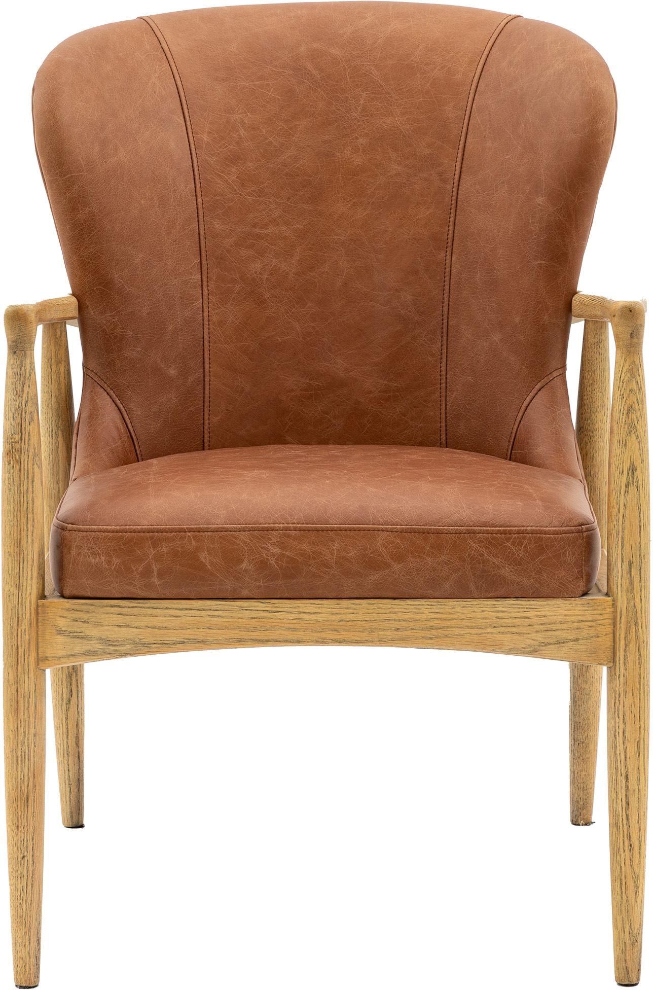 Add a retro touch to a room with this beautiful armchair. The seat and back are fully upholstered in vintage style brown leather, which pairs perfectly with the elegant wooden frame.