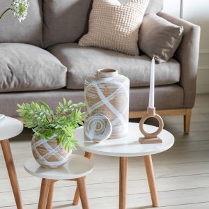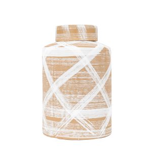 Gallery Direct Tarka Jar Reactive Brown White Perfect for storage anywhere in the home, this handmade cylindrical lidded jar features a stunning white and brown reactive glaze with a hand painted brushstroke look, making each piece truly unique. Matching vases also available