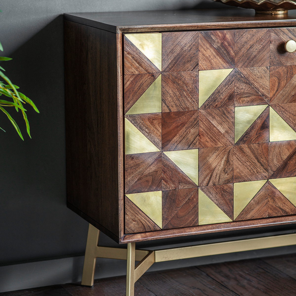 This three door sideboard is a functional storage piece with style – the inliad brass and Acacia wood sections create Doorama to this stylish sideboard the look is completed with the brushed brass finished legs