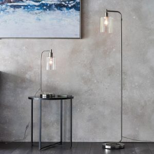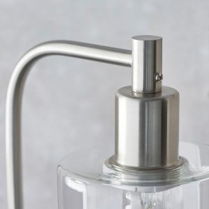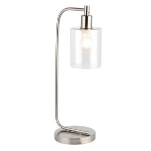 A modern table light for contemporary interiors. Brushed nickel finish with clear glass shade and inline switch.