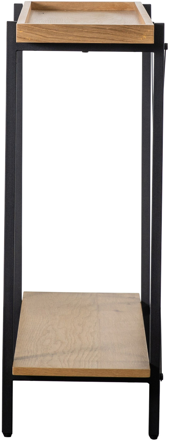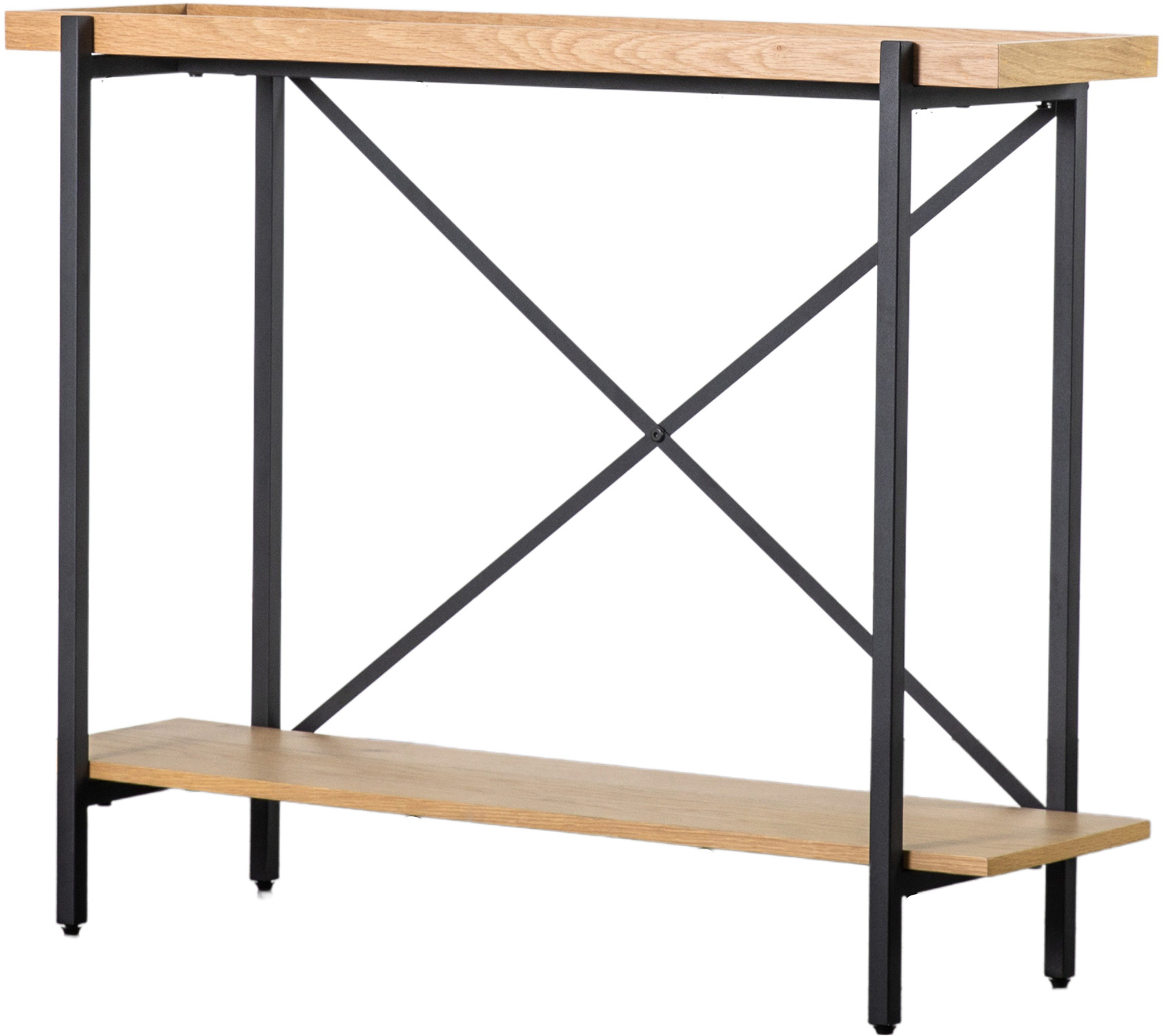 Offering a stunning contemporary look, this console table combines matt black metal with oak. The table top and shelf are tray-style with oak veneer tops and solid oak surrounds. Matching pieces are available.