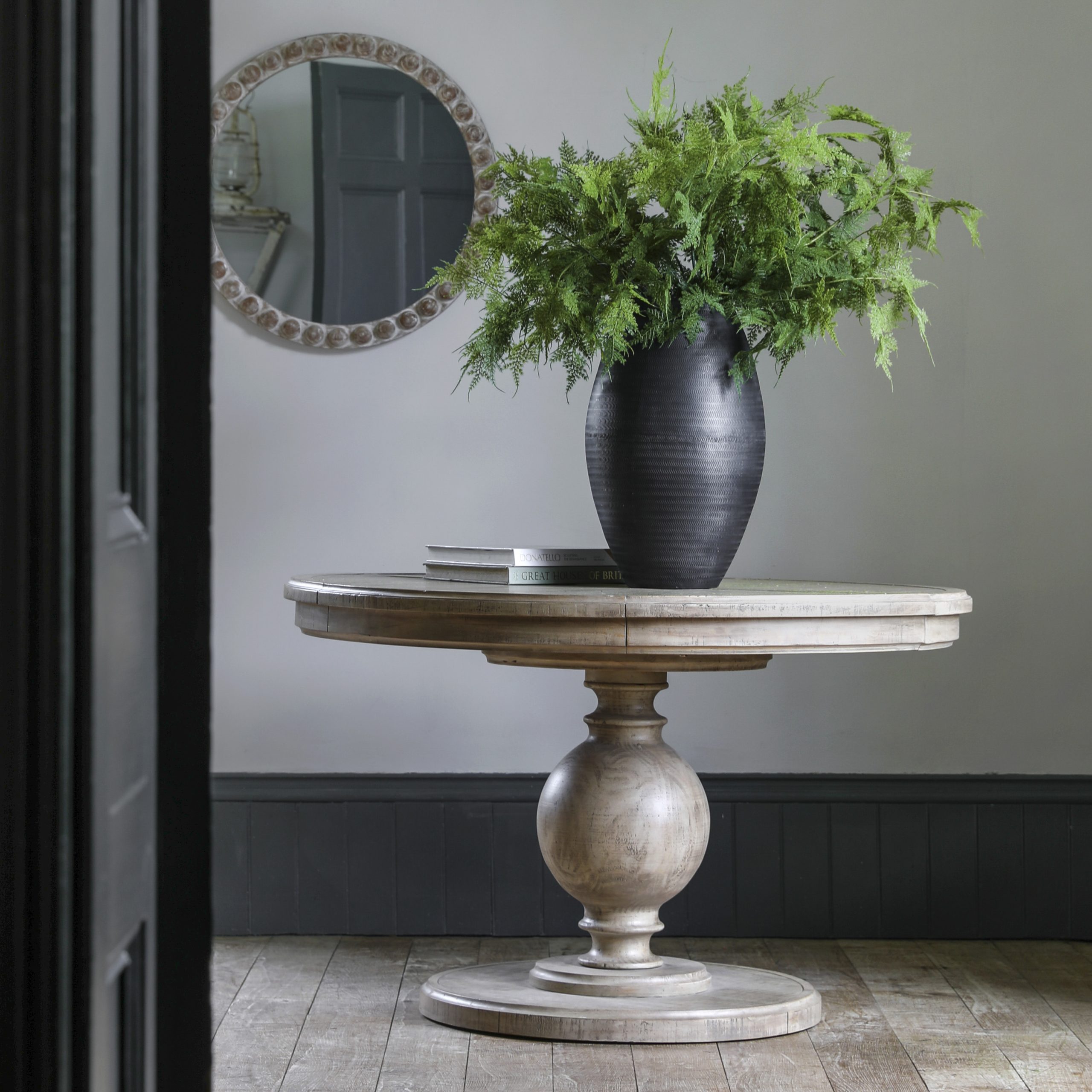 This lovely round dining table is extendable to seat extra guests for added practicality. It is crafted from North American pine solids and veneers where practical, with the clever use of a mill saw giving characteristic features of cross sawn timber to create a tactile, Dooramatic finish. Matching pieces are available.
