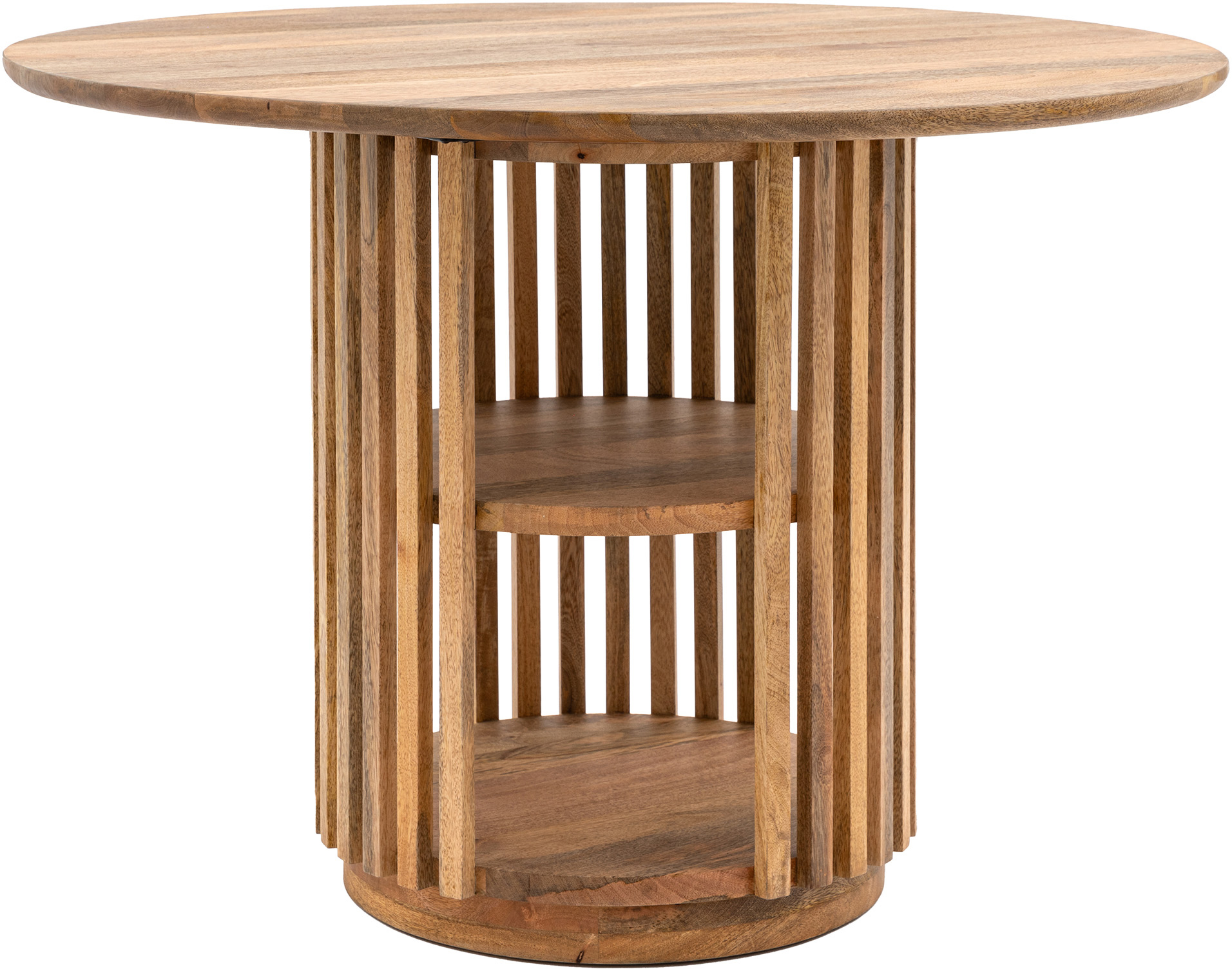 With an eye-catching slatted base featuring 2 handy storage shelves, this table won’t go unnoticed. This stand out table is made in Mango wood with a natural finish to show off the rich deep wood grain. Seats 4 people. Coordinating items also available.