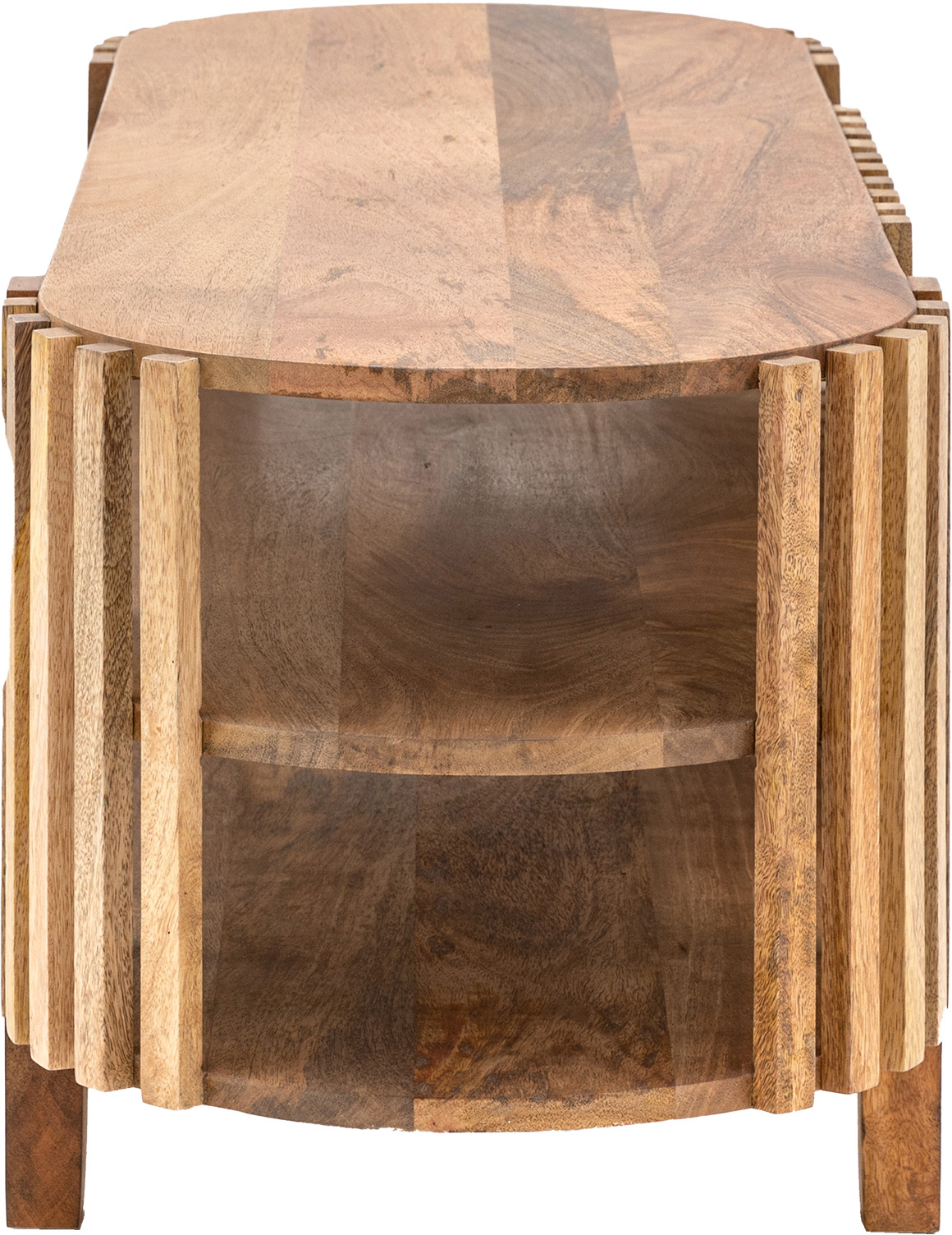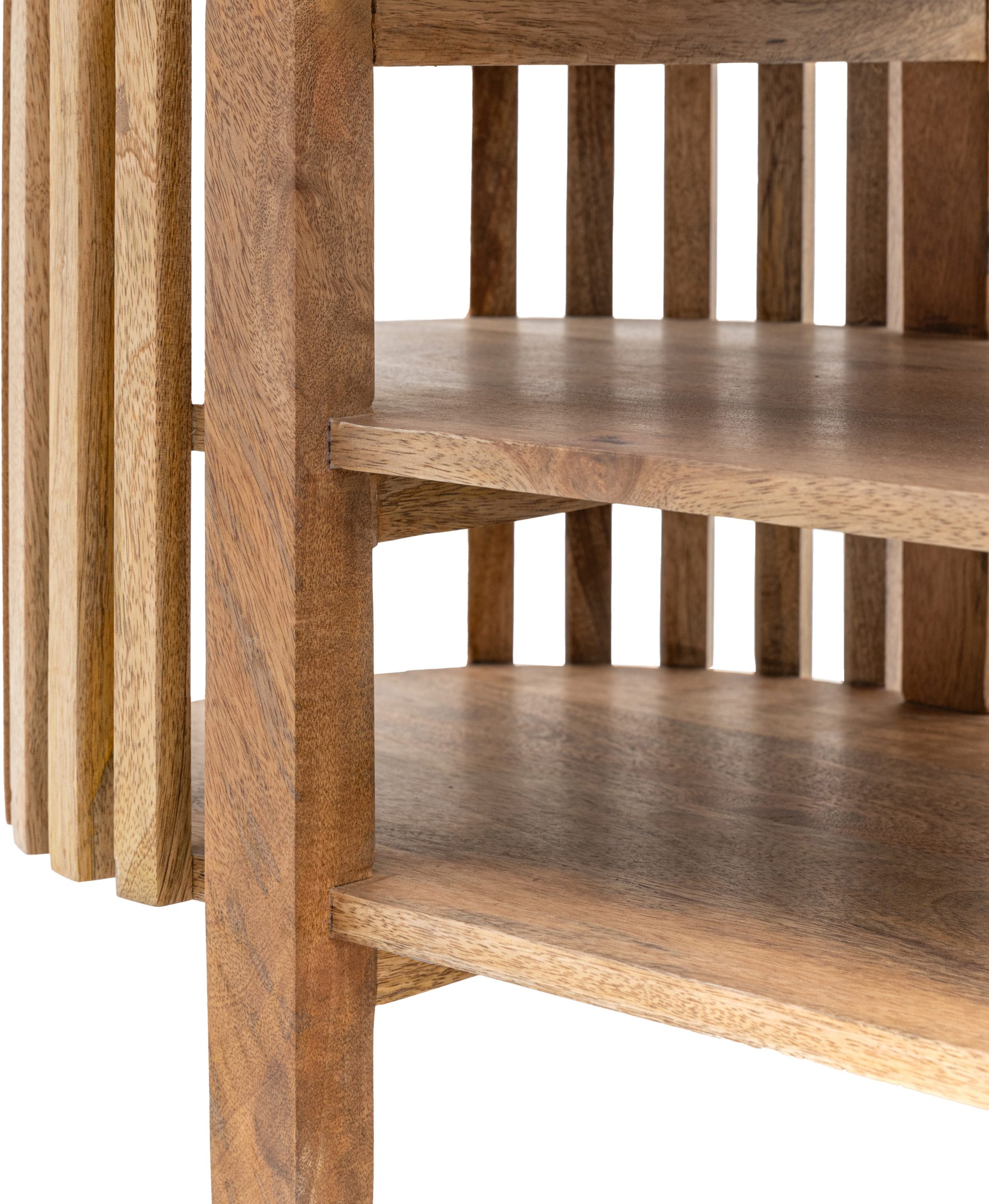 With plenty of storage for all of your electronics, this eye catching media unit is the perfect balance of practicality and style. The oblong unit features an unusual vertical slatted design and 3 shelves, so you’ll never be short of space. Made from Mango wood in a natural finish that shows off the rich deep grain of the wood. Coordinating items also available.